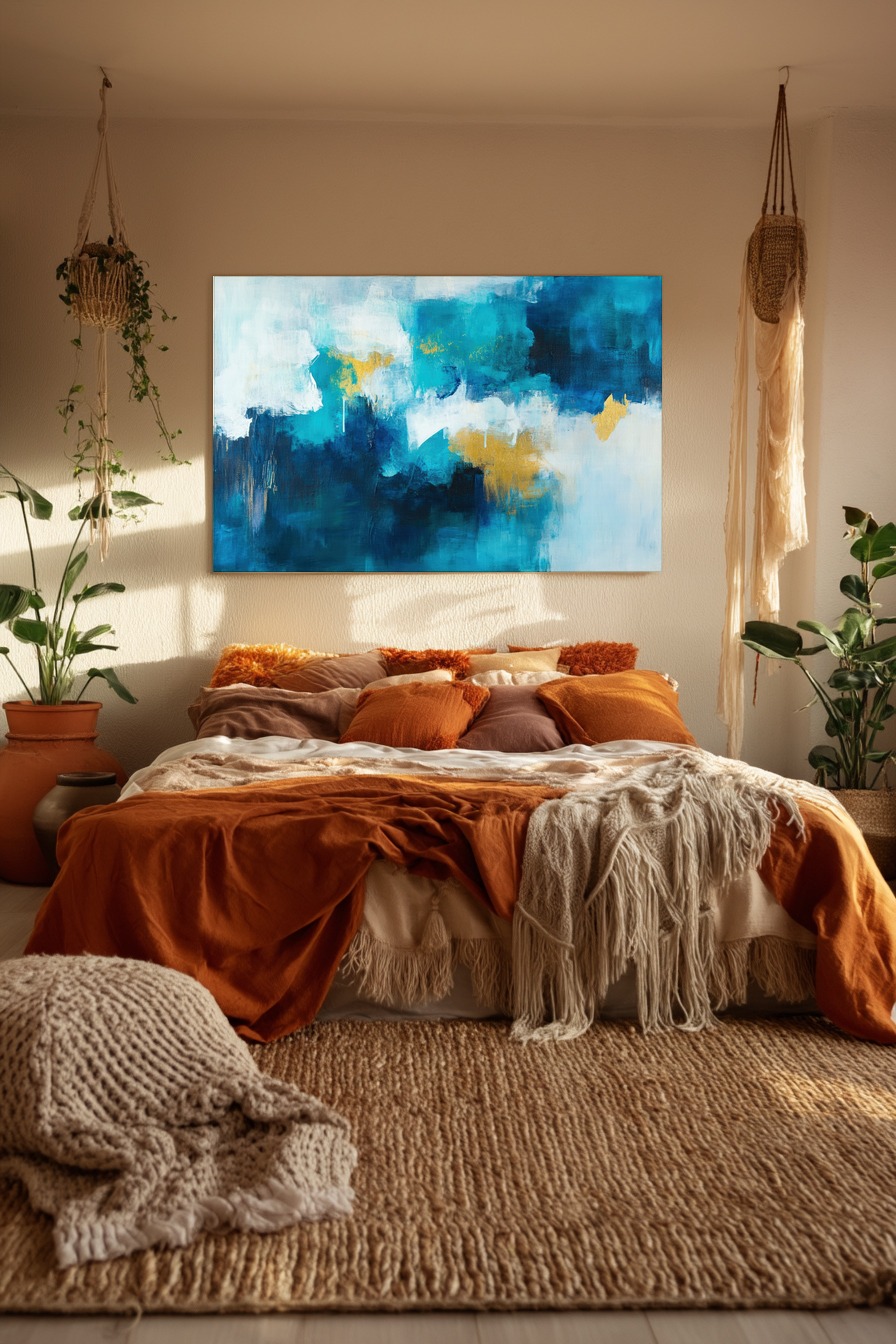Abstraktes Poster mit Farbschichten in Blau und Gold, klar strukturierte Farbflächen in kräftigen Farben auf halbmattem Papier