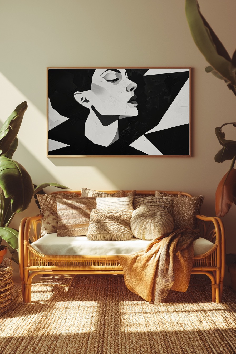 Schwarz-weiß Kunstdruck eines abstrahierten Frauenkopfs mit geometrischen Formen, modernes Wandbild im klaren Stil