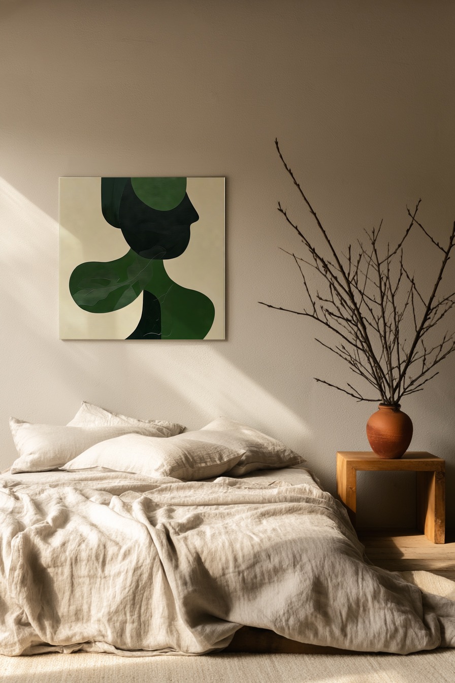 Diese abstrakte Komposition zeigt die Silhouette einer Frau in verschiedenen Grüntönen und Schwarz. Das Bild wirkt modern und minimalistisch mit klaren, fließenden Formen.