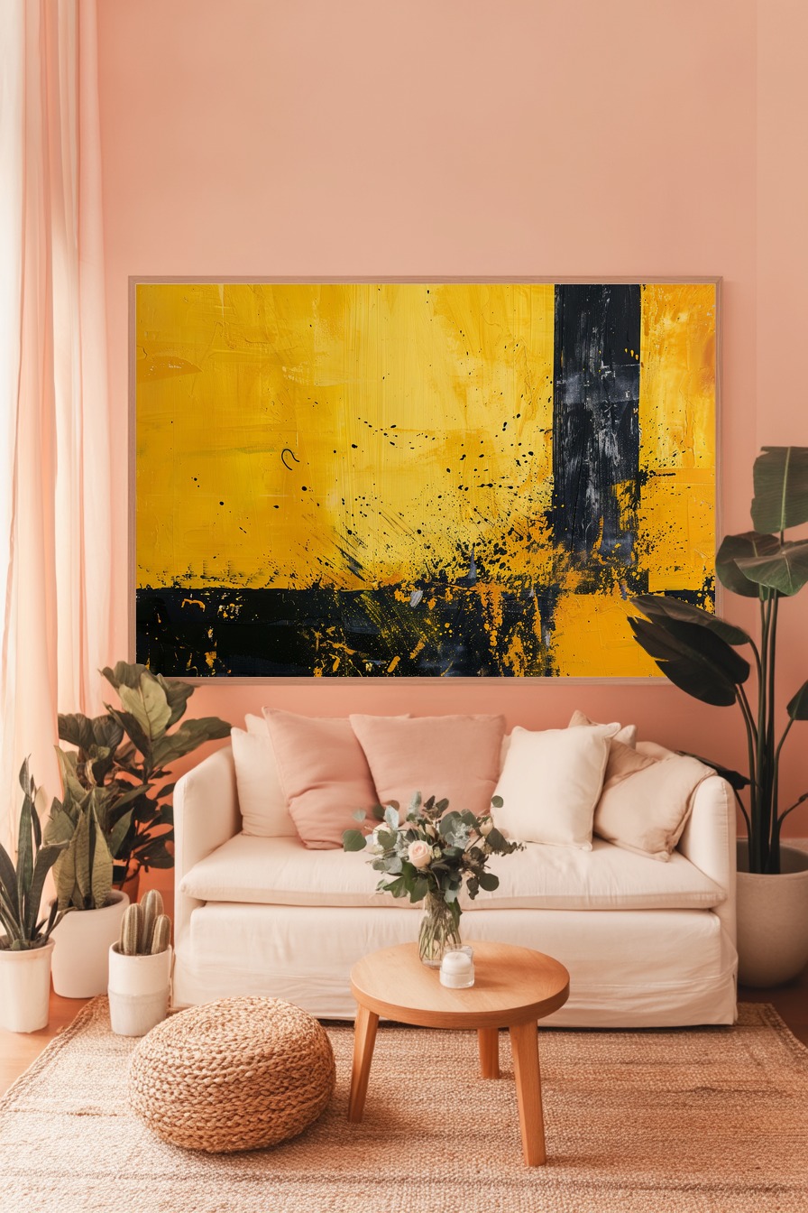 Abstraktes Poster mit gelben und schwarzen Farbflächen und Spritzern, strukturiert, moderner Kunstdruck