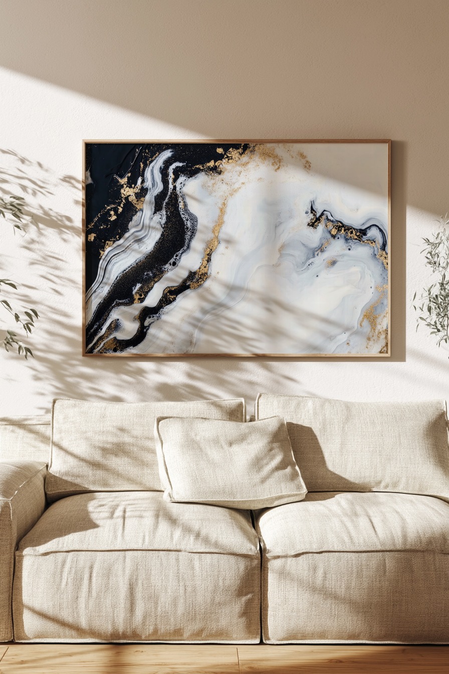 Dieses Motiv zeigt eine elegante, fließende Marmorstruktur mit kontrastreichem Schwarz, Weiß und edlen Goldakzenten. Die Kombination wirkt luxuriös und modern zugleich.