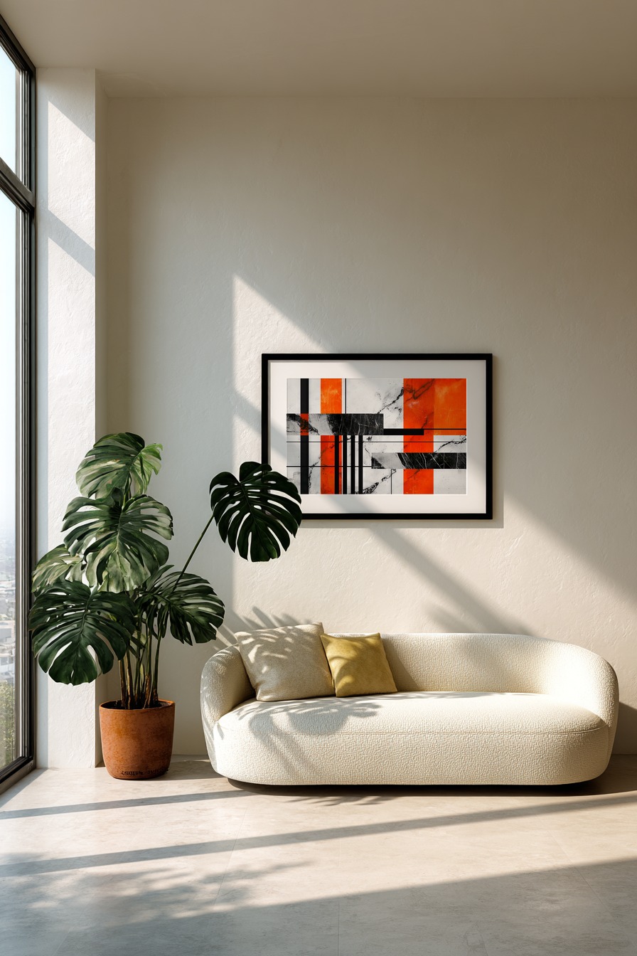Kontrastreiche Linien und Marmorstruktur auf 170 g/m² FSC-Papier mit halbglänzender Oberfläche. Schlichte Formen treffen auf kräftiges Rot. Wird ungerahmt geliefert – zum selbst Einrahmen oder solo an der Wand.
