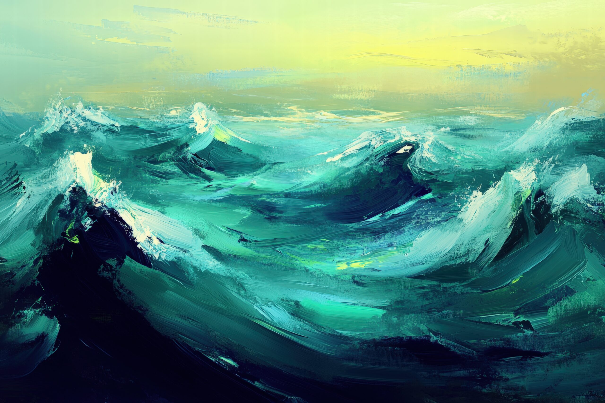 Das Bild zeigt kraftvolle Meereswellen in leuchtenden Blau- und Grüntönen vor einem gelblichen Himmel. Der expressive Malstil verleiht der Szene Dynamik und Tiefe.