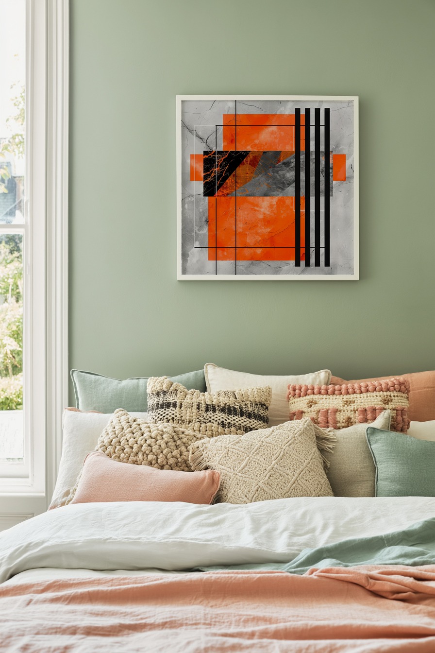 Die klaren schwarzen Linien durchbrechen das leuchtend orange Quadrat markant und präzise. Das Zusammenspiel der eckigen Flächen mit den organisch wirkenden Marmor-Strukturen erzeugt einen spannenden Kontrast. Dieses Bild zeigt ein intensives Spiel aus Kraft und Struktur.