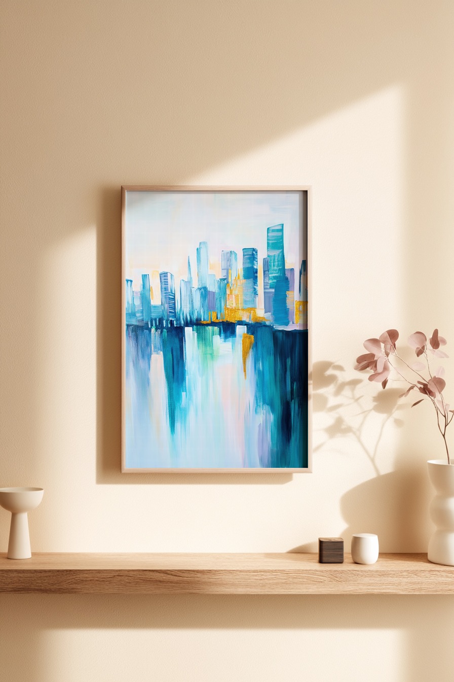 Kunstdruck mit abstrakter Stadt Skyline und spiegelnden Hochhäusern in kühlen Blautönen und goldenen Akzenten