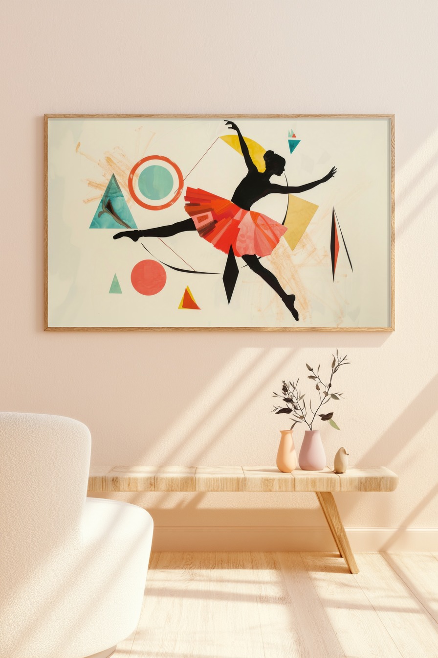 Der Rock der Tänzerin zieht mit seinen intensiven Rottönen alle Blicke an. Die Bewegung scheint eingefroren, lebendig durch die geometrischen Formen, die dem Bild Rhythmus verleihen. Ein Spiel aus Schatten und Farbe, das Leichtigkeit und Dynamik vereint.