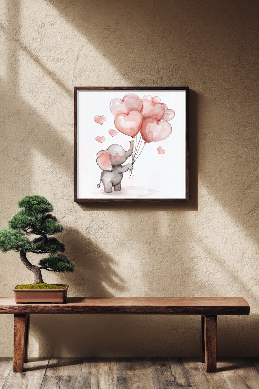 Rosa Herzluftballons, glänzend und zart, an kleinen Rüssel gehalten. Der Elefant hebt die Ballons fast zärtlich, winziger Schatten darunter. Ein schlichter, doch emotionaler Blickfang.