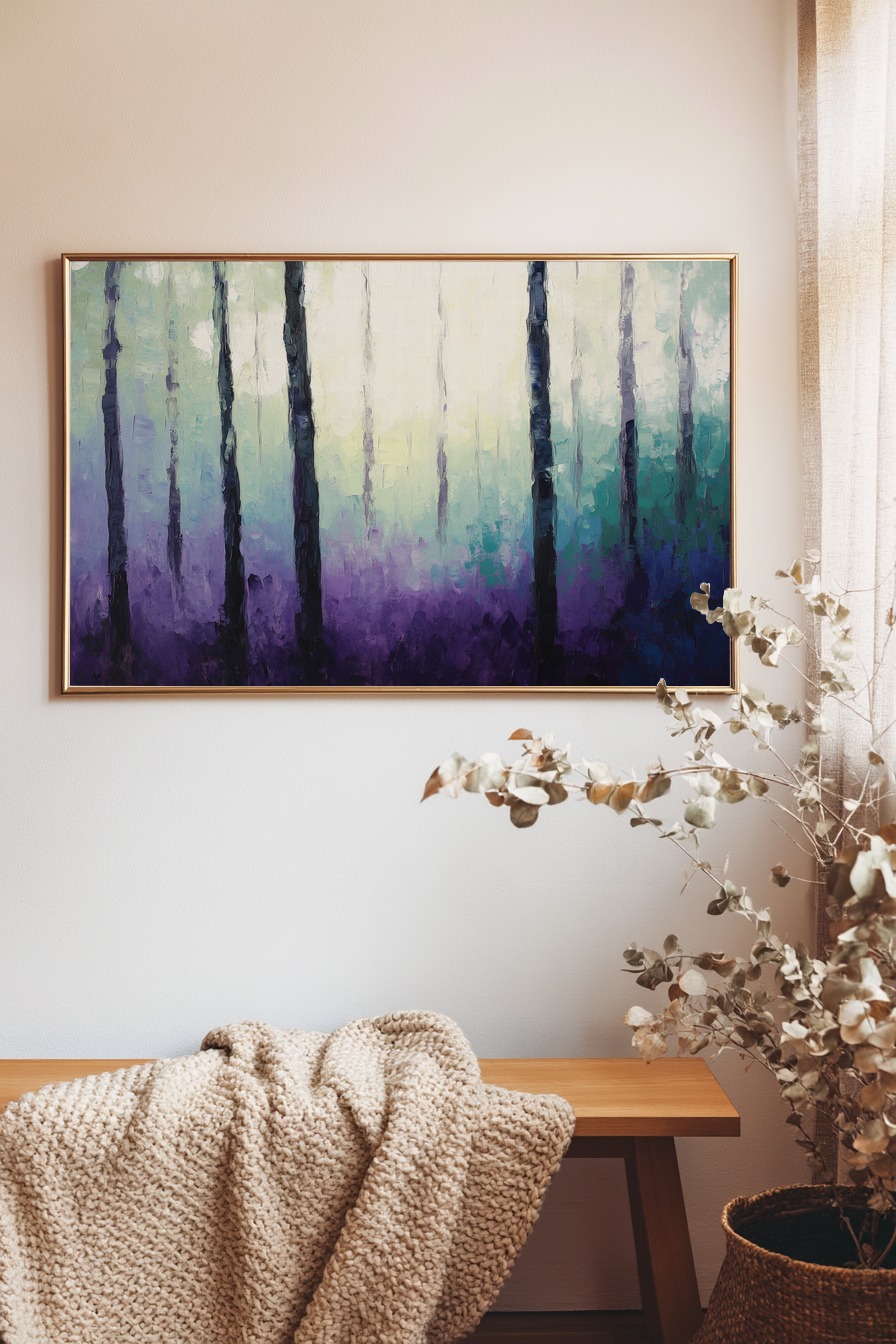 Poster mit nebligem Wald in violetten und blauen Tönen, ruhige Naturstimmung als Kunstdruck
