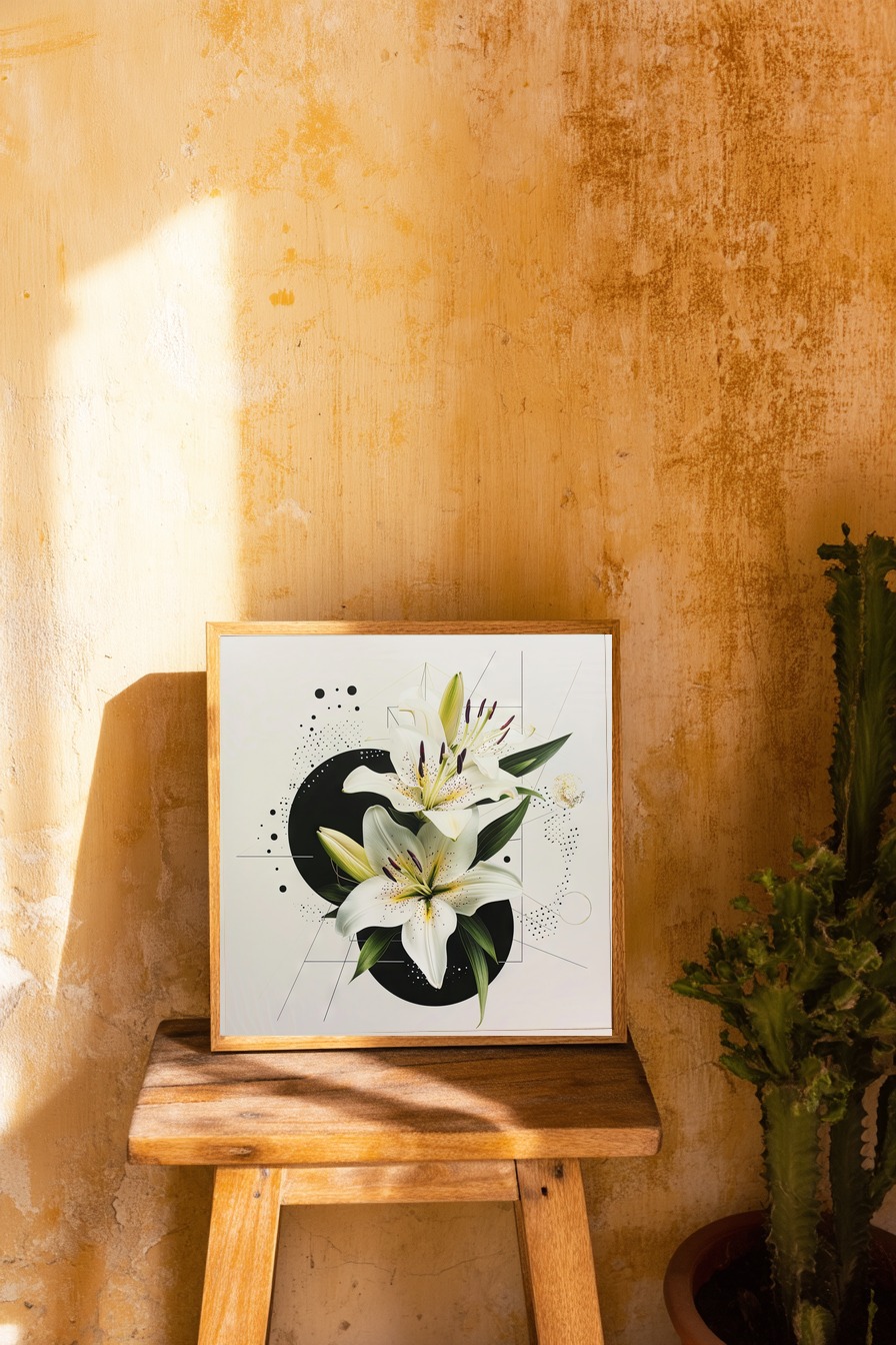 Weiße Lilie mit grünen Blättern vor abstrakten schwarzen Formen. Gedruckt auf halbmattem Papier (170 g/m², FSC-zertifiziert) mit matter Oberfläche. Wird ungerahmt geliefert – zum Selbstrahmen oder solo an der Wand.