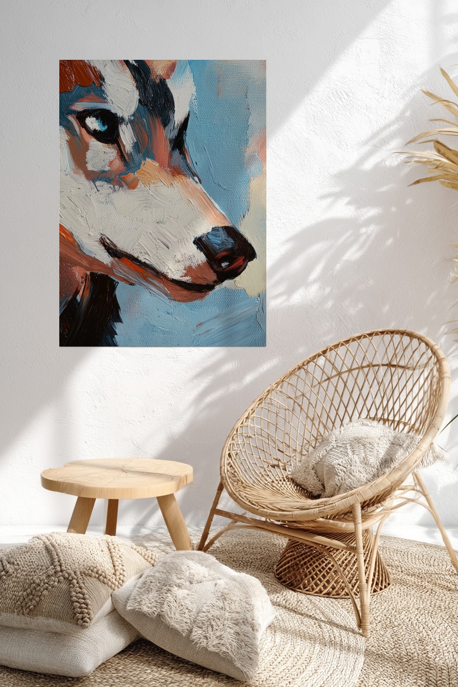 Dieses detailreiche Ölgemälde zeigt das Gesicht eines Hundes in Nahaufnahme. Die kräftigen Pinselstriche und die kontrastreiche Farbgebung verleihen dem Bild Lebendigkeit.