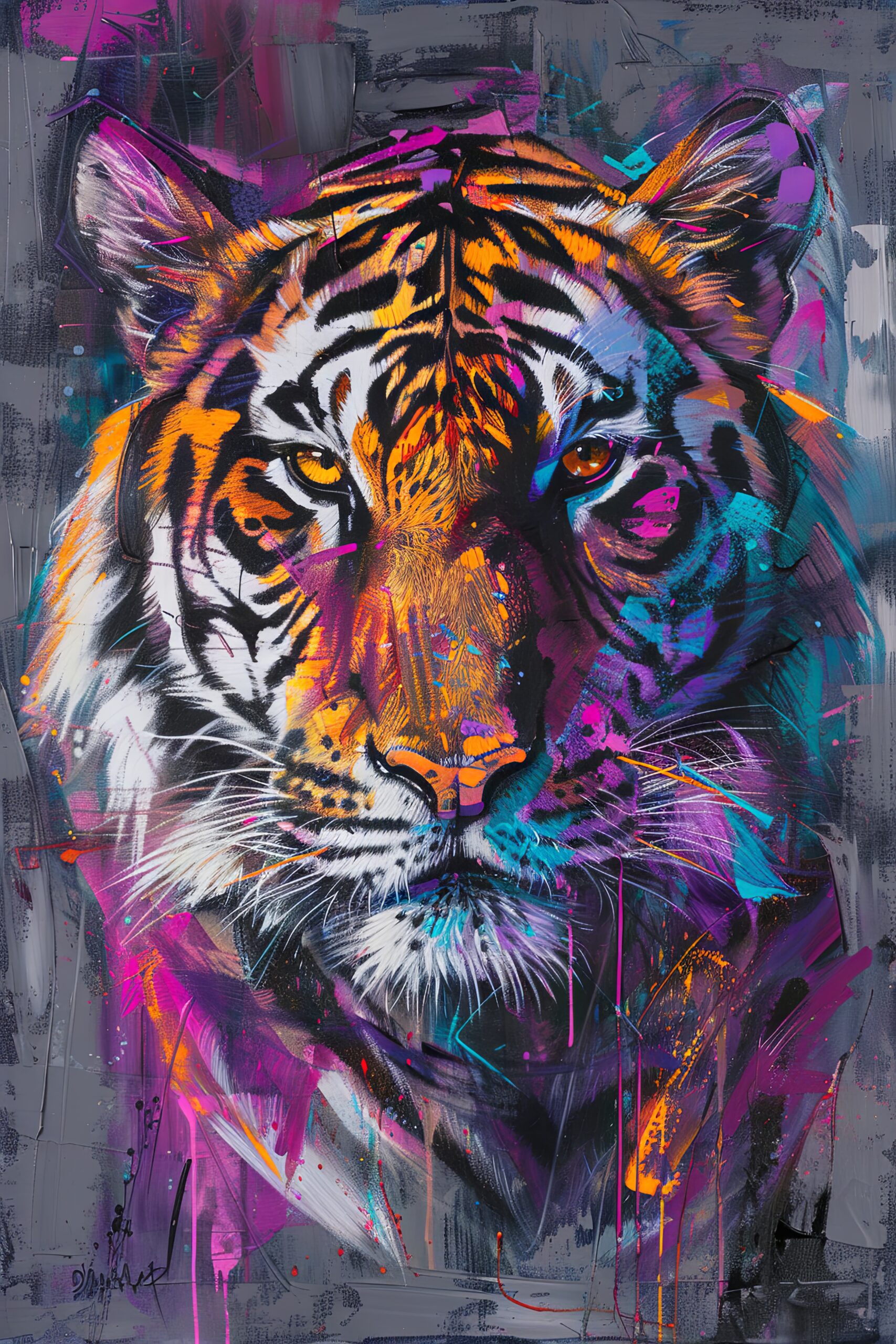 Ein Tigerkopf mit kräftigen Farbakzenten, ruhig und nah. Gedruckt auf halbmattem Papier (170 g/m², FSC-zertifiziert). Die Oberfläche verstärkt die Farben mit einem dezenten Glanz. Wird ungerahmt geliefert – zum Selbstrahmen oder solo an der Wand.