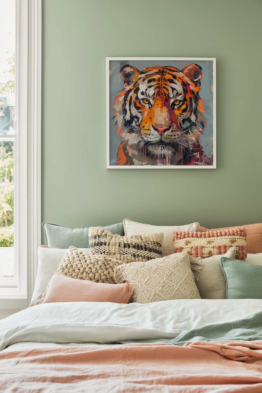 Ein intensives Tigerporträt in kräftigen Farben. Gedruckt auf halbmattem Papier (170 g/m², FSC-zertifiziert). Die Oberfläche verstärkt die Farbeffekte ohne zu spiegeln. Wird ungerahmt geliefert zum individuellen Einrahmen.
