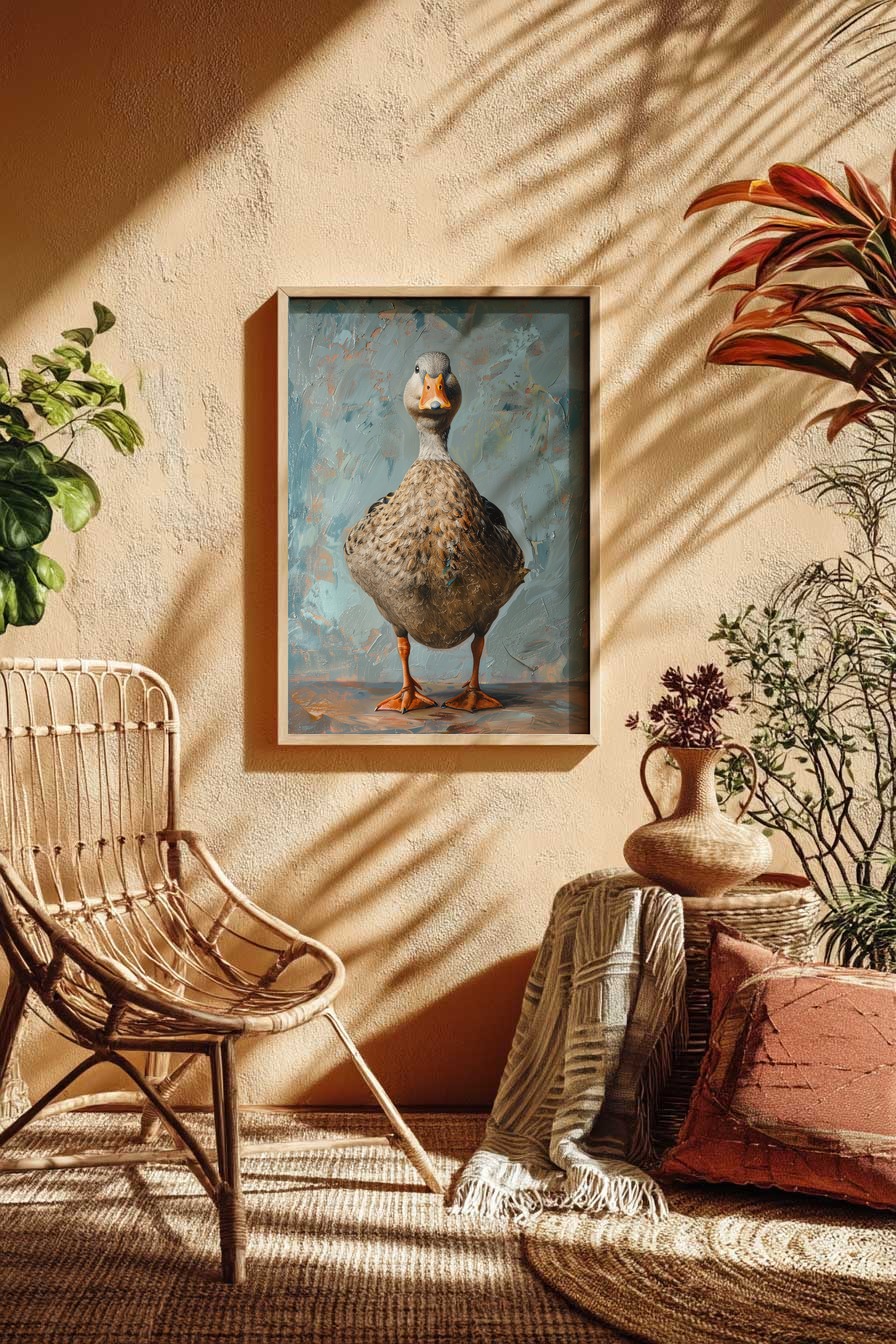 Ein ruhiges Porträt einer Stockente mit leicht erhobenem Kopf. Gedruckt auf halbmattem 170 g/m² FSC-Papier, das matte Oberfläche ohne Reflexion bietet. Wird ungerahmt geliefert und kann individuell eingerahmt oder solo an die Wand gehängt werden.