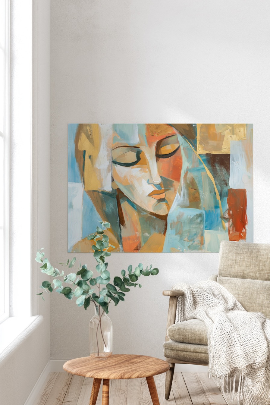 Konturiertes Frauenportrait aus farbigen Flächen und geometrischen Formen.