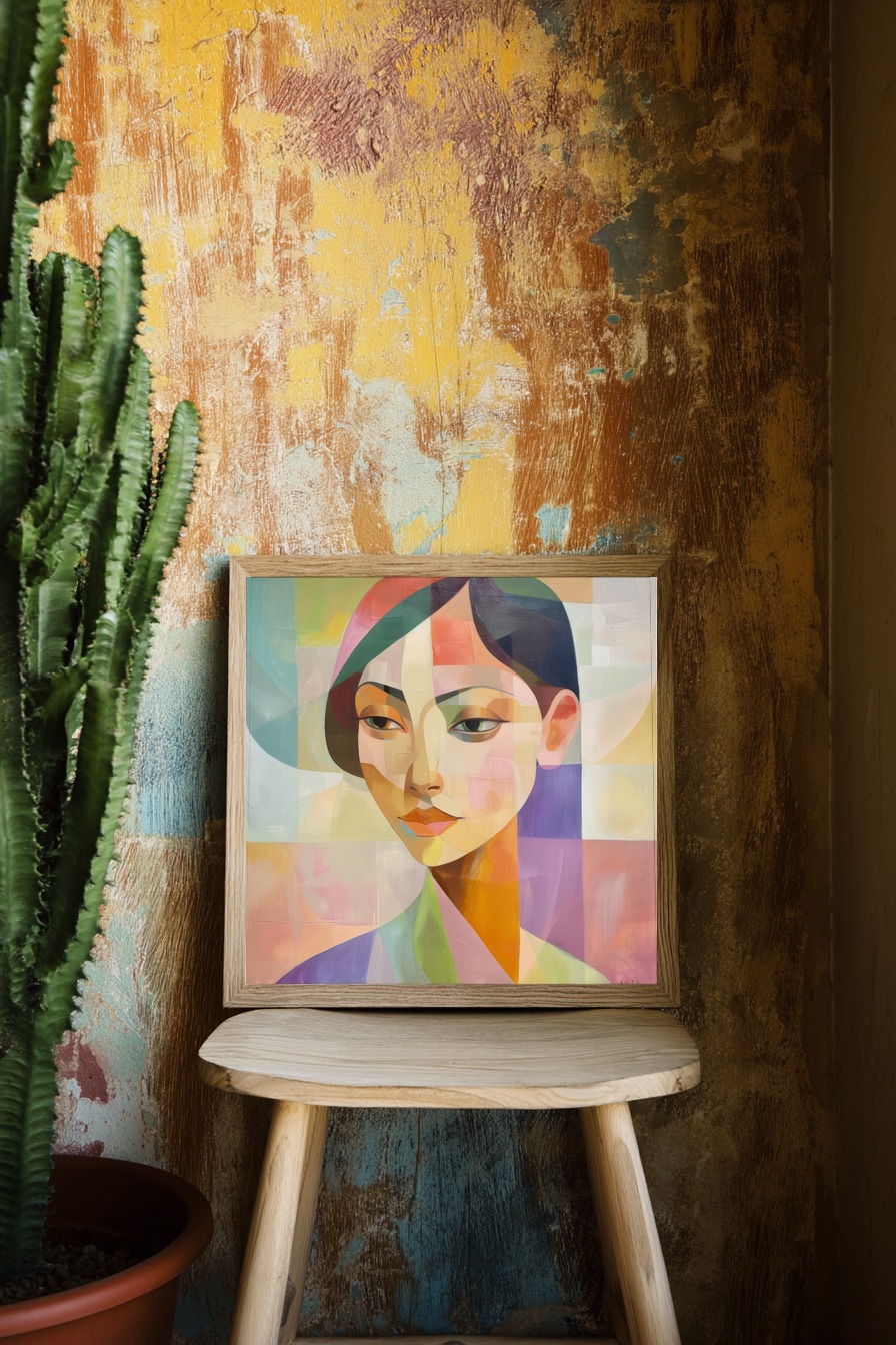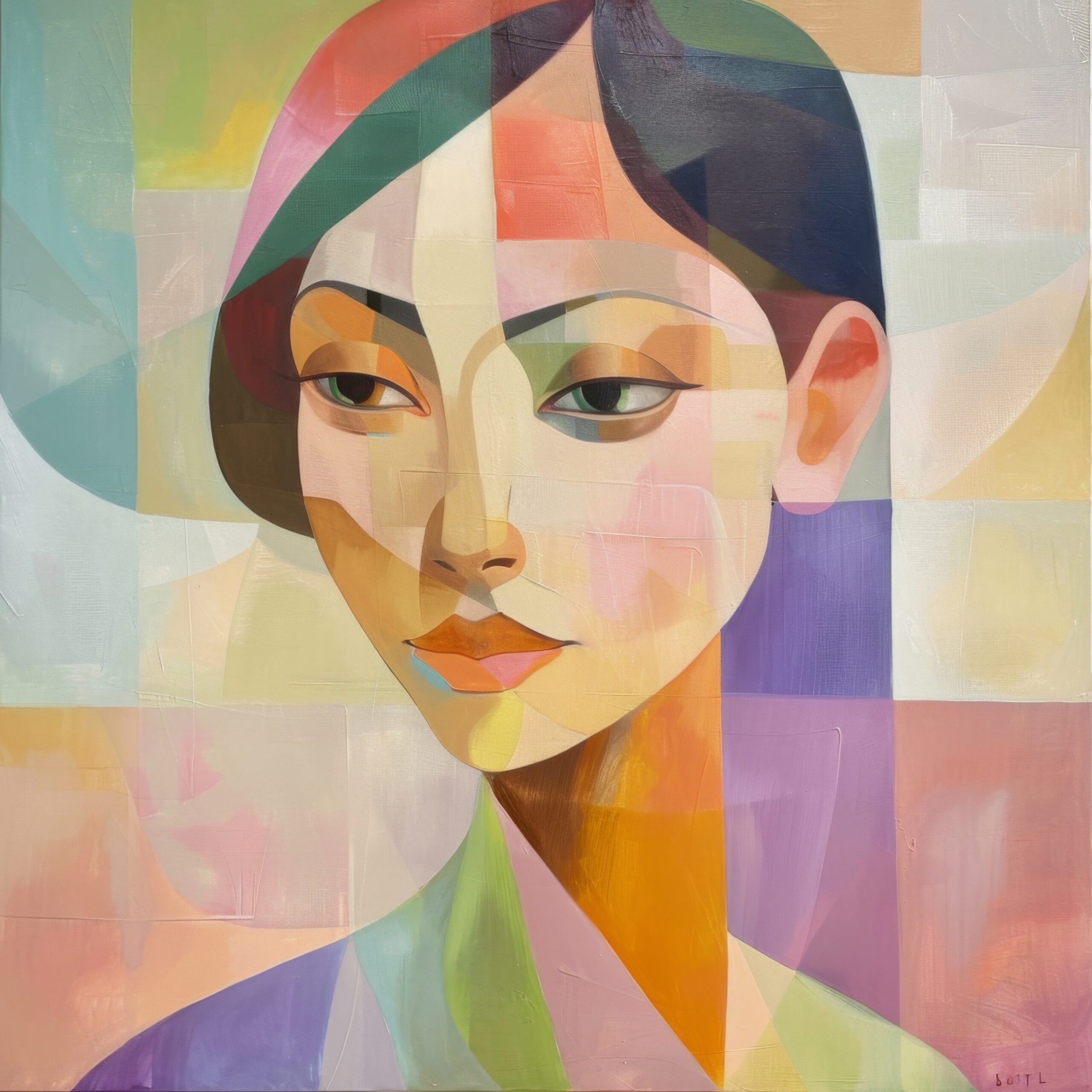 Die etwas schräg stehenden Augen lenken den Fokus sofort auf den Gesichtsausdruck. Die subtile Farbverschiebung und geometrische Aufteilung verleihen der Komposition eine moderne Spannung.
