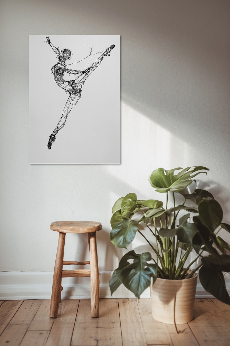 Poster einer Ballerina aus schwarzen Linien in dynamischer Tanzpose auf weißem Hintergrund im minimalistischen Stil