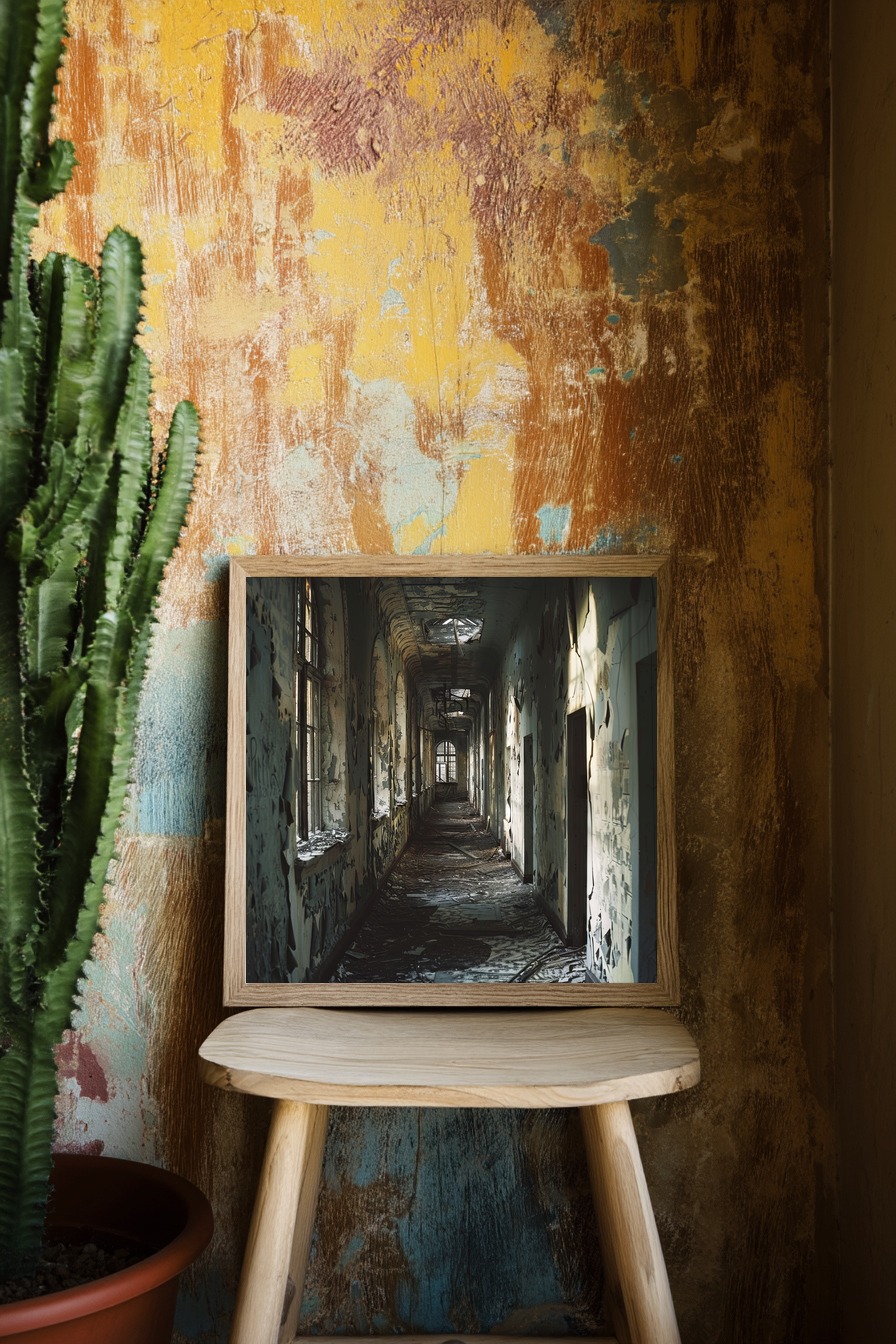 Die abgeblätterten Fensterrahmen sind das erste, was ins Auge sticht. Sie zeichnen ein Bild von lange verlassener Zeit. Ein düsterer und eindringlicher Flur öffnet sich davor, der Raum wirkt leer und verloren.
