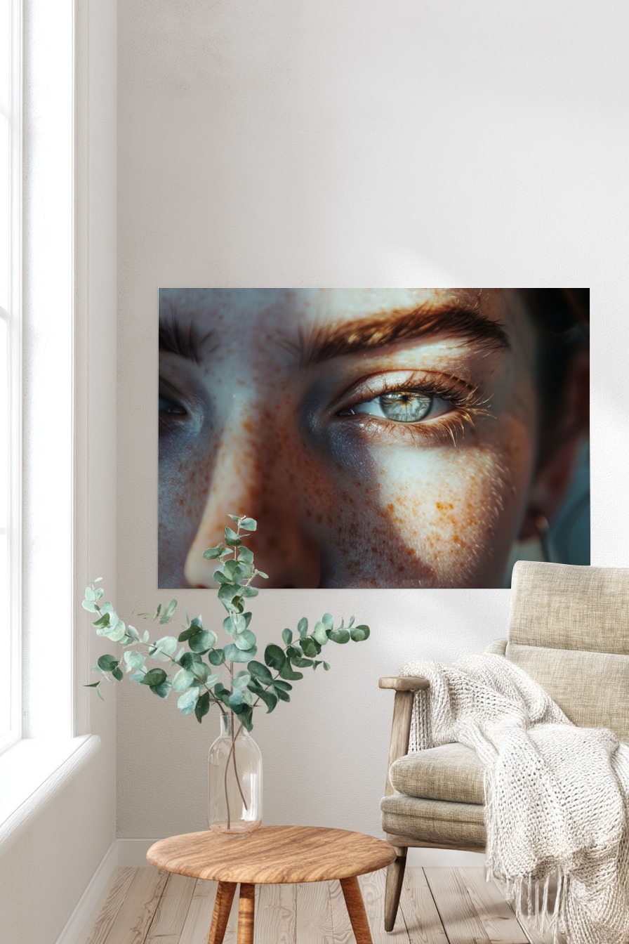 Das Auge steht scharf im Mittelpunkt, die feinen Wimpern und irisierend komplexen Strukturen ziehen den Blick an. Die Sommersprossen auf der Haut ergänzen die Intensität und verleihen dem Porträt Charakter. Ein Bild, das Nähe und Individualität zeigt.