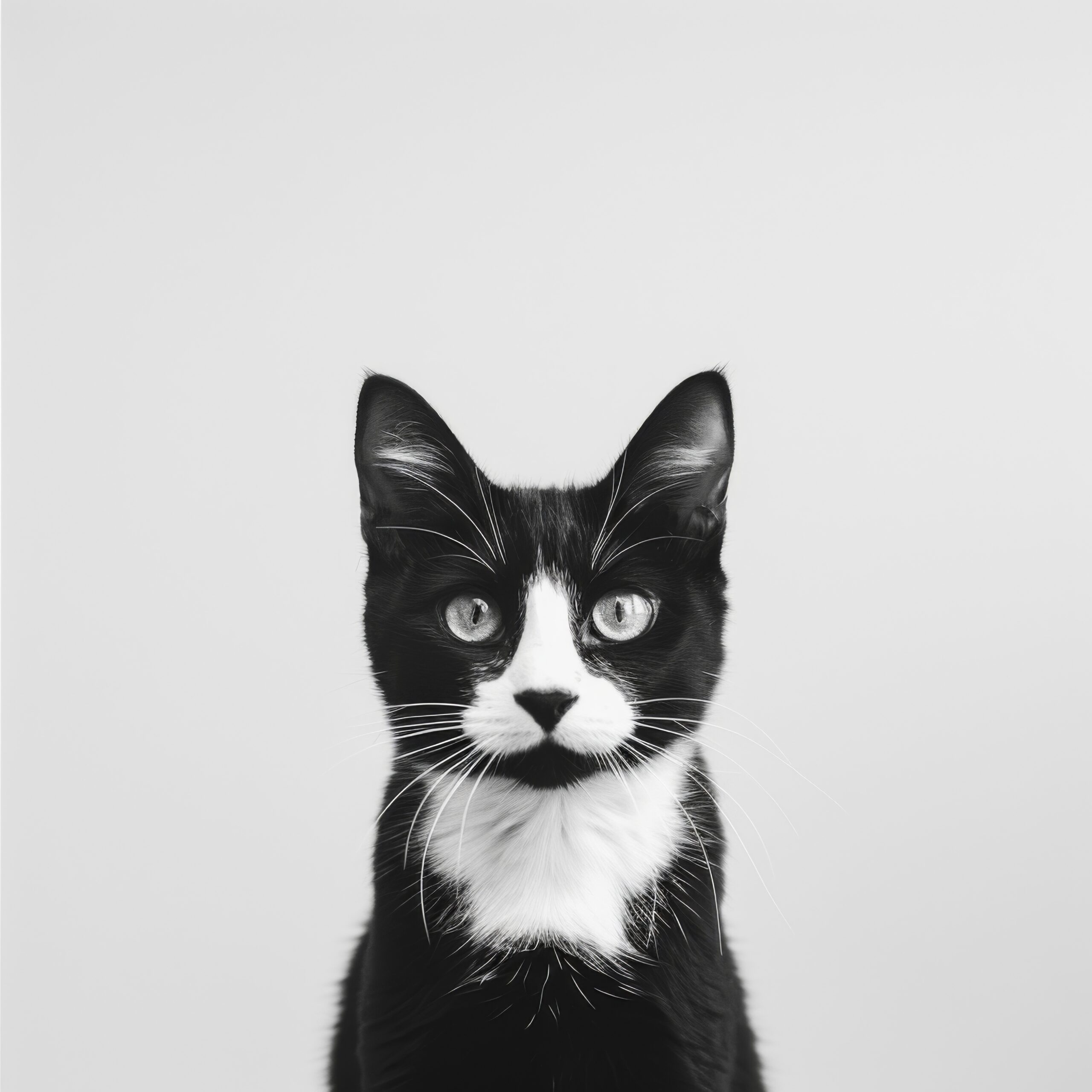 Die kontrastreiche Fellzeichnung zeichnet die klaren Formen des Gesichts scharf nach. Der Blick der Katze fesselt und wirkt ruhig konzentriert. Die monochrome Darstellung verstärkt die minimalistische Anmutung des Fotos.