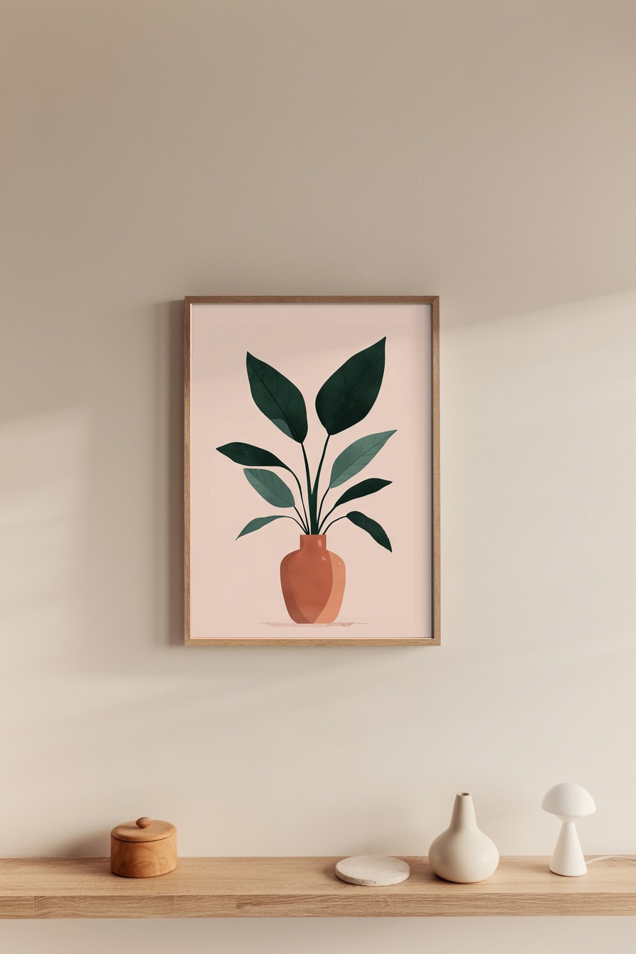 Vase in Terrakottaton. Blätter in zwei Grüntönen. Schatten und Licht leicht angedeutet.