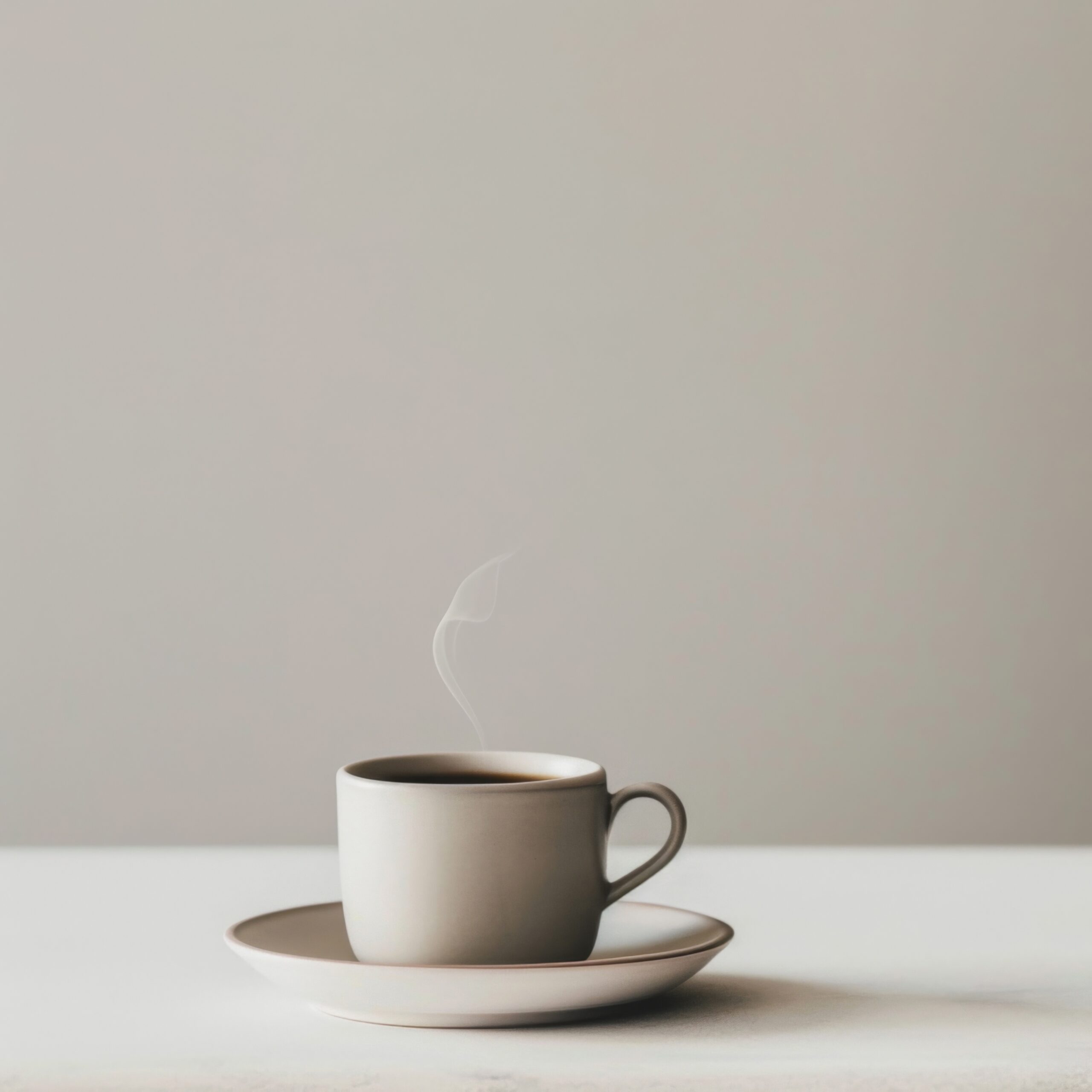weiße Tasse mit Kaffee steht auf Untertasse mit leichtem Dampf