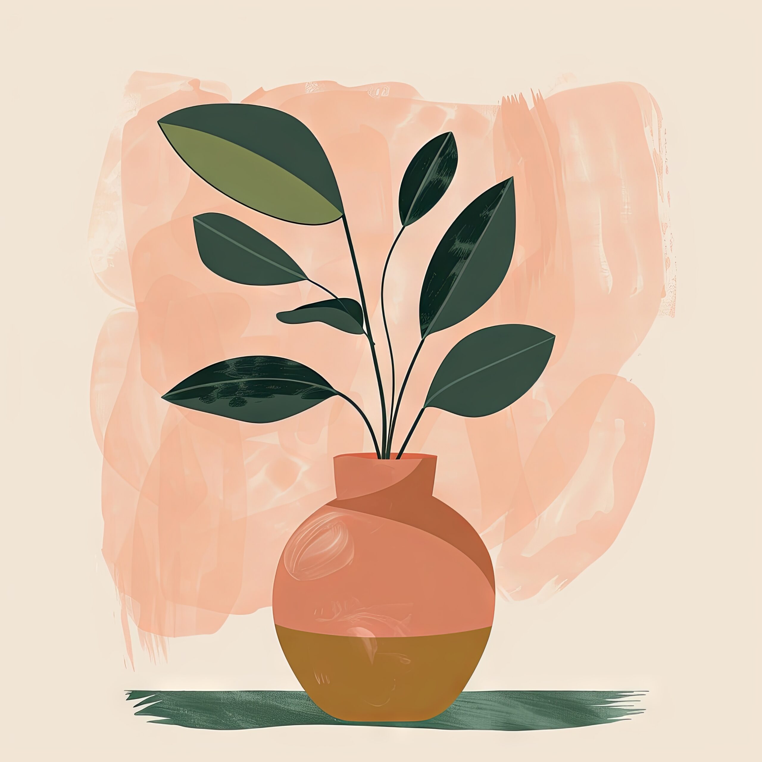 Die glatt gezeichnete Vase fängt auf der unteren Hälfte mit einem hellen Braunton ein überraschendes Lichtspiel ein. Darüber strecken sich matte dunkelgrüne Blätter an schlanken schwarzen Stielen fast schwebend nach oben. Das Bild wirkt leise und fokussiert.