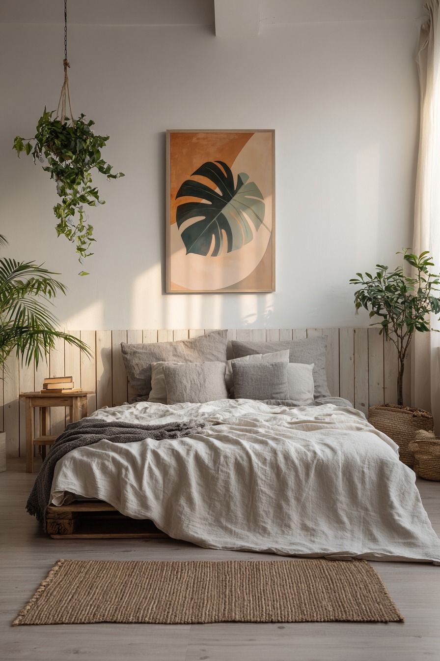 Das Motiv zeigt ein großes Monstera Blatt in gedeckten Farben vor abstraktem Hintergrund. Die warmen Erdtöne schaffen eine ruhige Atmosphäre.