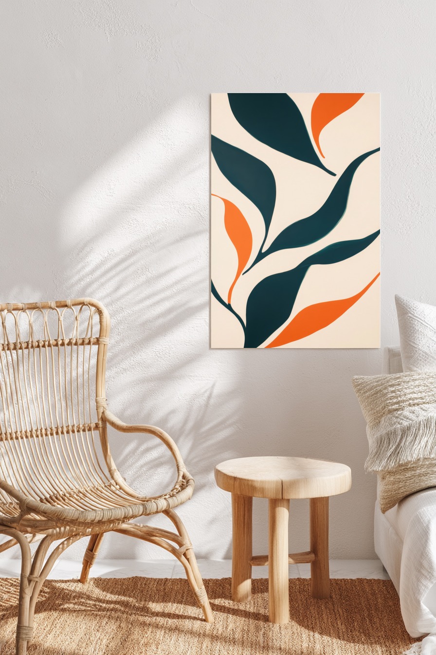 Das Motiv zeigt abstrakte Blattformen in Dunkelgrün und Orange auf einem beigen Hintergrund. Die weichen, geschwungenen Formen wirken lebendig und modern.