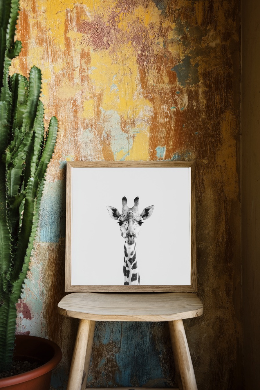 Die Details des Fells und der Gesichtszüge treten klar hervor, jede Kontur wirkt sorgfältig eingefangen. Die Augen groß und wachsam, mit langen Wimpern, geben dem Bild einen intensiven Ausdruck. Die klare Trennung von Schwarz und Weiß lässt das Muster der Giraffe grafisch erscheinen.