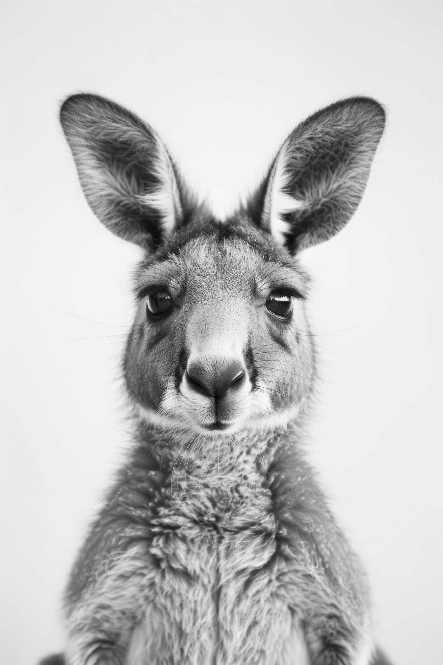 Frontalaufnahme eines Kängurus. Scharfe Details im Fell und den Augen. Weißer Hintergrund.