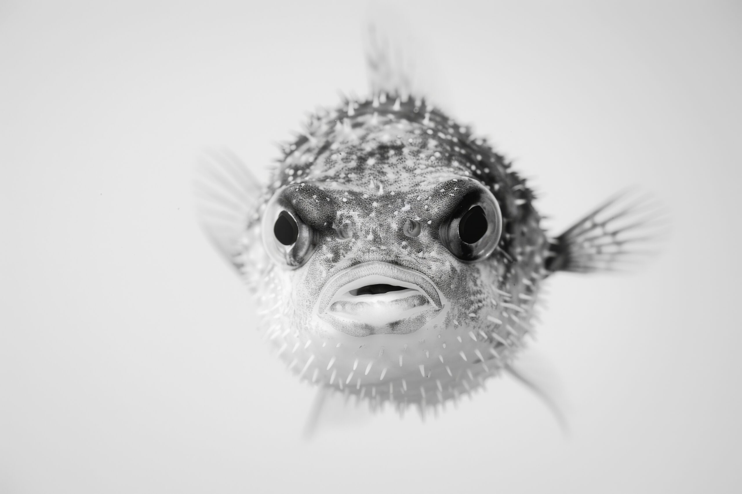 Die stachelige Haut schärft den Blick auf den Kugelfisch, dessen Frontalaufnahme eine direkte Präsenz zeigt und die skurrile Gestalt betont.