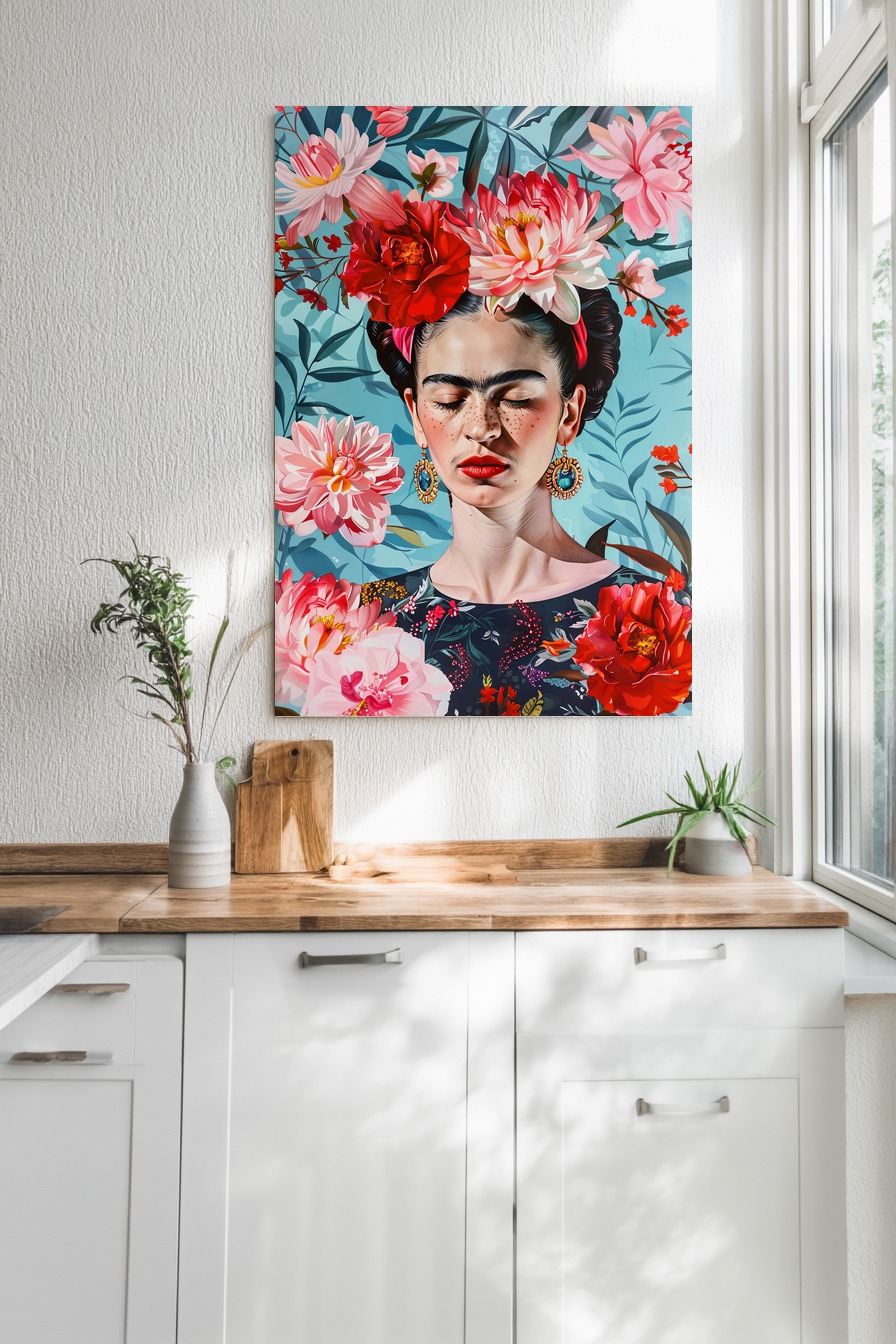 Ein Frauenportrait mit geschlossenen Augen und großem Blumenkranz. Gedruckt auf halbmattem Papier (170 g/m², FSC-zertifiziert) mit dezenter Brillanz. Wird ungerahmt geliefert, geeignet zum Selberrahmen.
