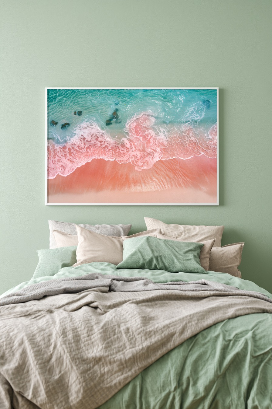 Die feinen Schaumkronen der Brandung zeichnen ein komplexes Muster auf den rosafarbenen Sand, während das klare Wasser sanft darüber fließt und eine ruhige Spannung erzeugt.