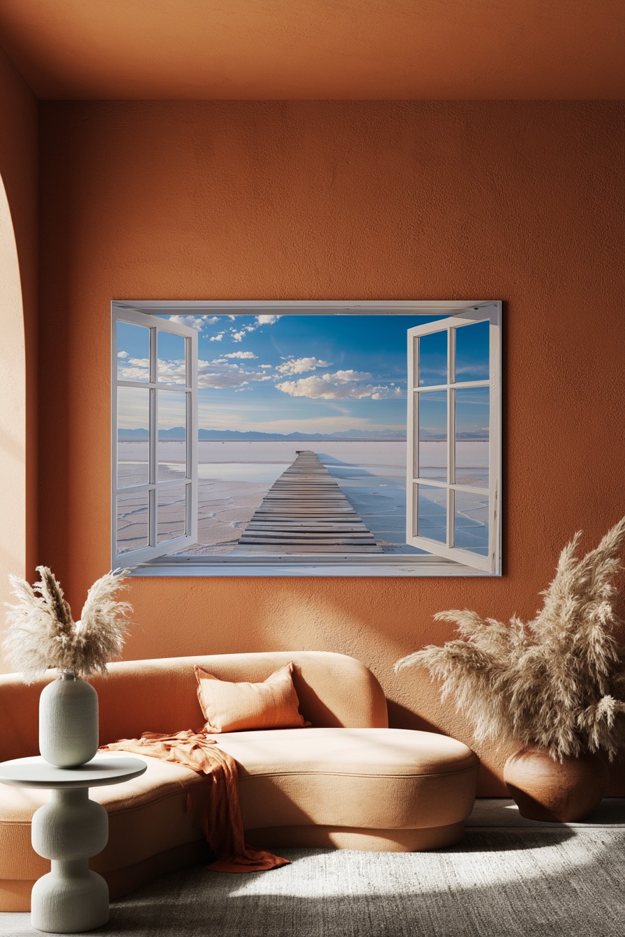Der lange Holzsteg führt geradlinig in die weite, flache Landschaft mit trockener, rissiger Oberfläche, vom Fensterrahmen eingefasst wirkt die Szene fast wie ein lebendiges Bild, dazu der helle Himmel mit zarten Wolken und blauen Farbverläufen.