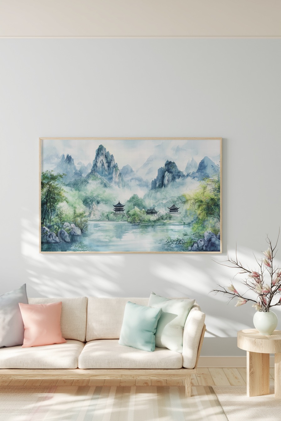 Diese Aquarelllandschaft zeigt sanfte Berge mit historischen Pagoden am Ufer eines ruhigen Sees. Das Bild vermittelt eine friedliche und neblige Atmosphäre im asiatischen Stil.