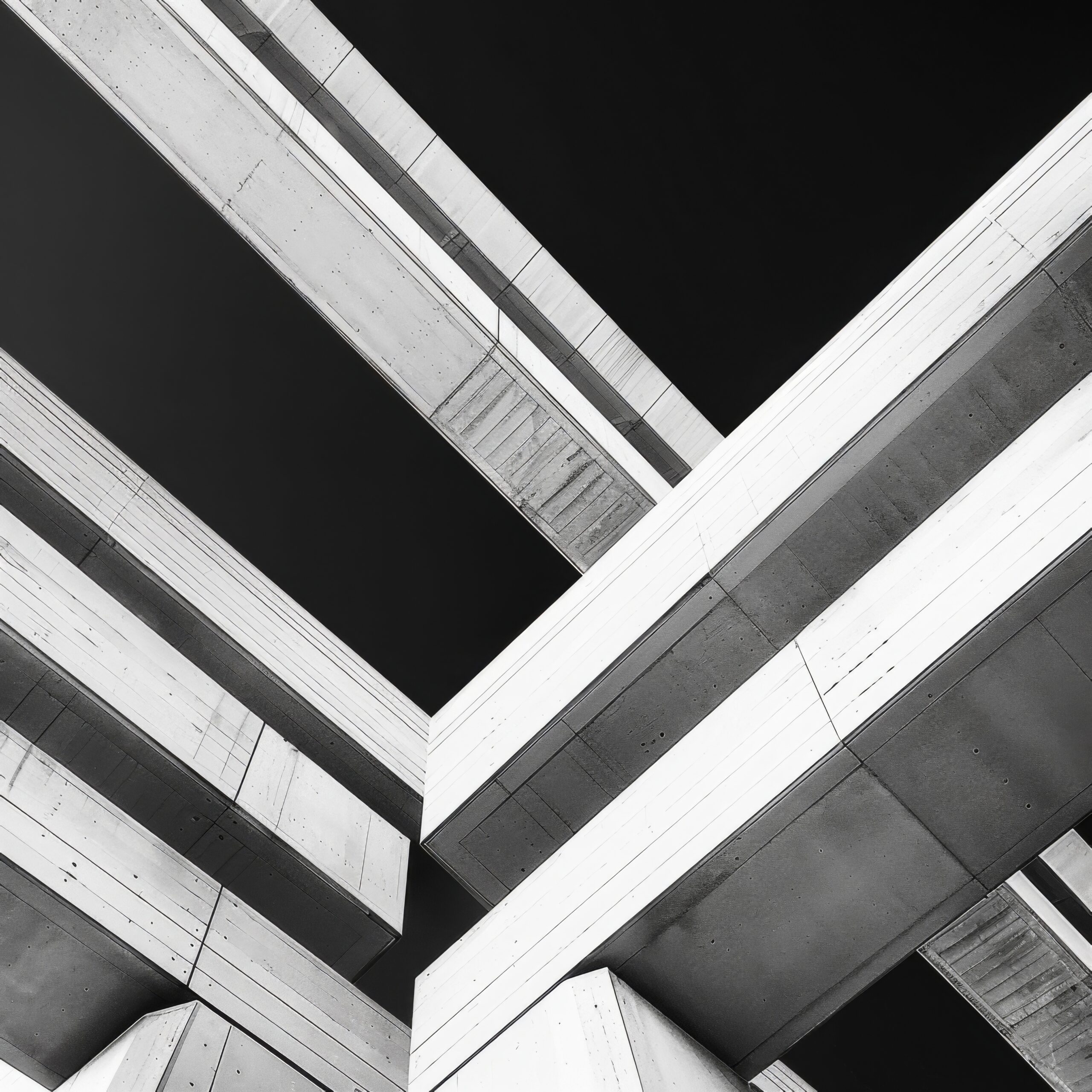 Das Bild zeigt eine abstrakte Ansicht von Betonbrücken aus der Vogelperspektive nach unten. Die starken Linien und der Kontrast erzeugen eine moderne, minimalistische Atmosphäre.