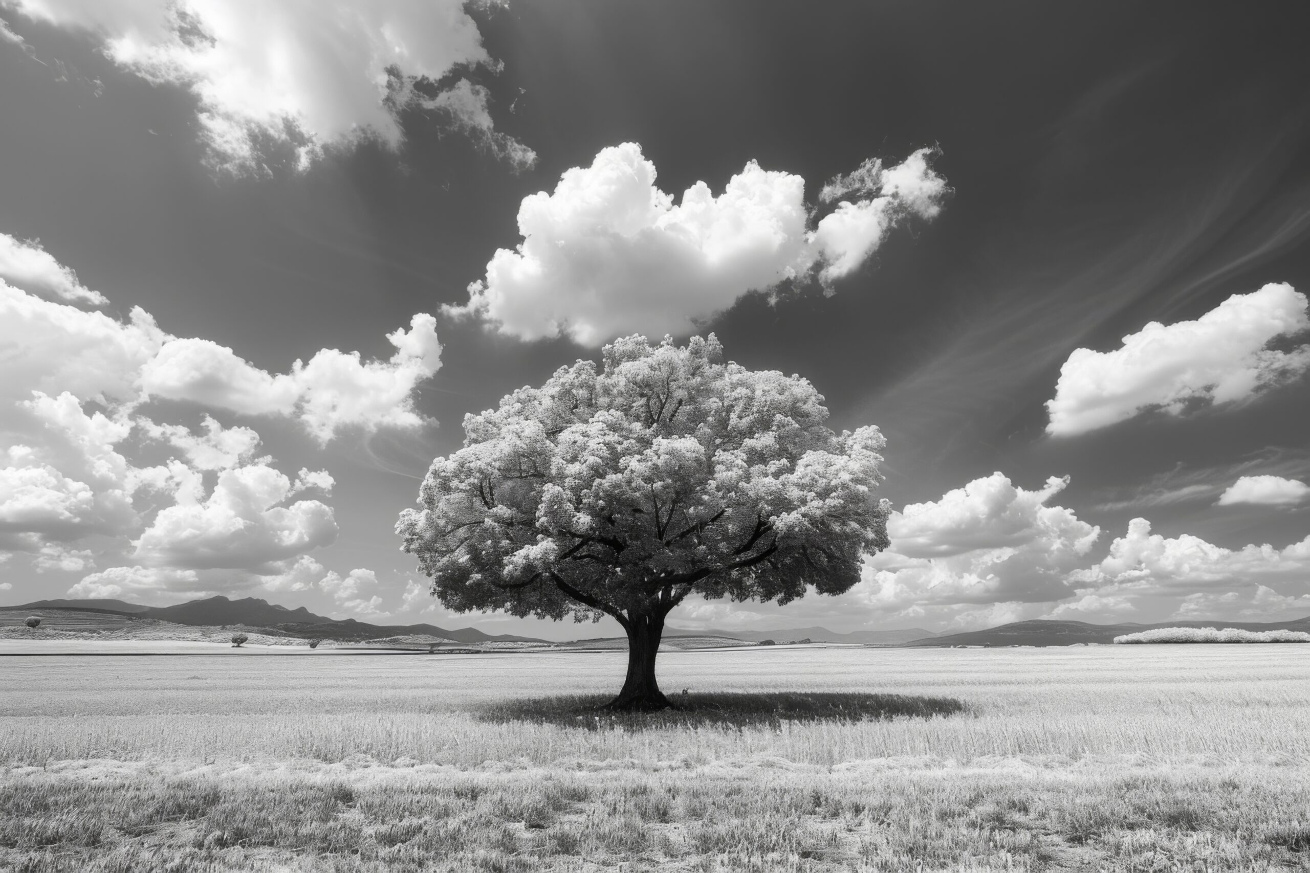 Die klar gezeichneten Äste formen dichtes Laub, das einen weichen Kontrast zur weiten Ebene bildet. Schatten wirft der Baum gleichmäßig unter sich, begleitet von weichen Wolken am Himmel. Einzelner Baum in Ruhe, umgeben von stiller Weite.