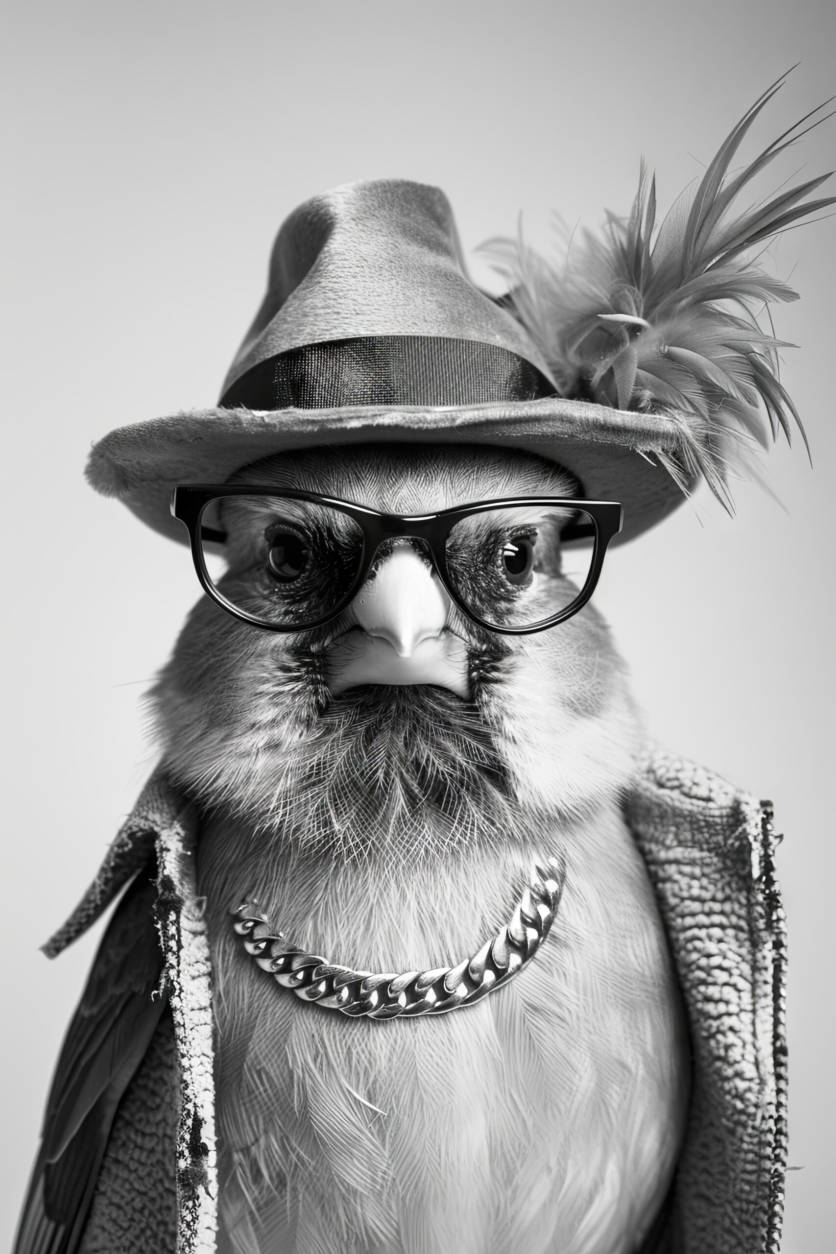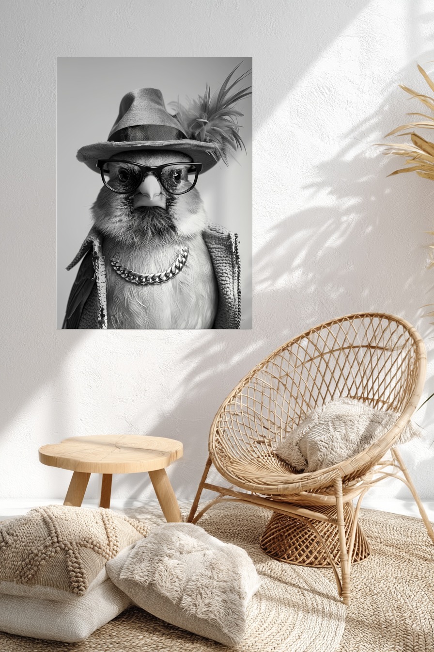 Stille Präsenz eines Vogels mit Hut und Brille. Gedruckt auf halbmattem 170 g/m² FSC-Papier. Die Oberfläche vermeidet Spiegelungen. Wird ungerahmt geliefert.