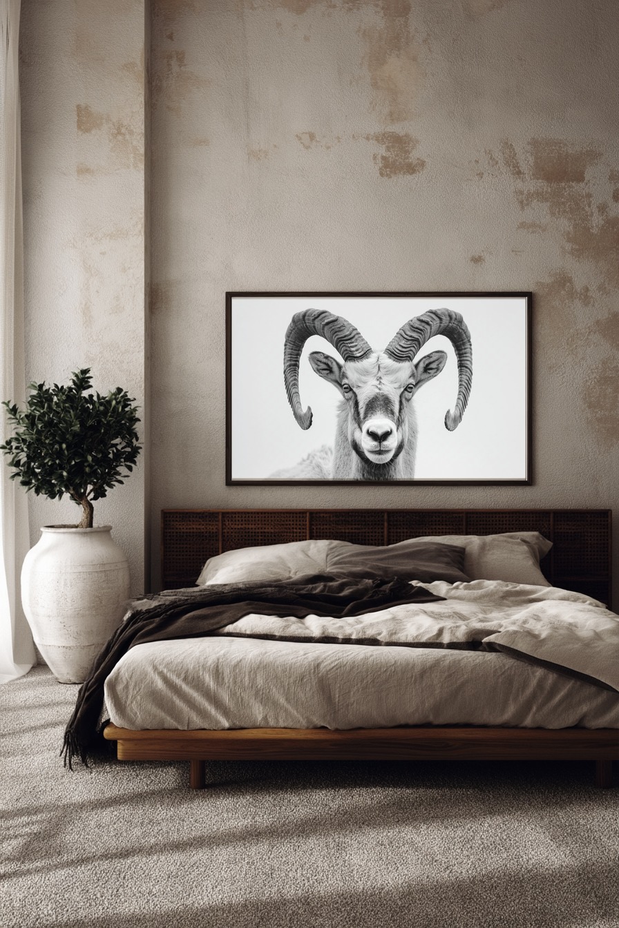 Die kraftvollen Hörner ziehen unmittelbar den Blick an, mit präzisen Rillen und markanter Struktur. Das Fell zeichnet sich durch feine Schattierungen und eine weiche Textur aus. Dunkle Augen blicken ebenso unverrückt wie ruhig, in der klaren monochromen Darstellung fast meditativ.