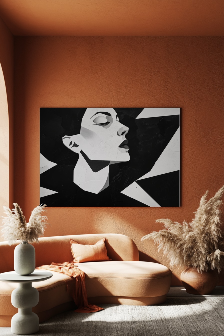 Dieses Bild zeigt ein stilisiertes Frauengesicht in Schwarz-Weiß. Klare Formen und starke Kontraste prägen das Bild.