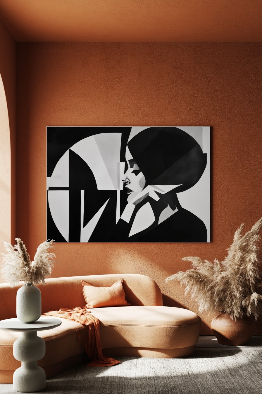 Dieses Bild zeigt ein abstraktes Frauenprofil in Schwarz-Weiß mit klaren Linien und geometrischen Formen. Die Komposition wirkt modern und reduziert.