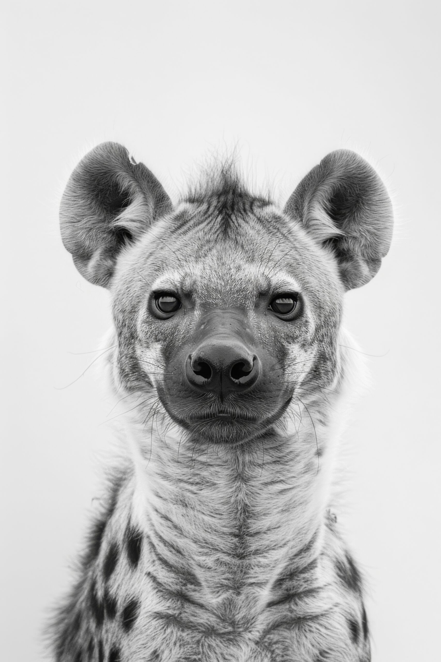 Das Porträt zeigt die feinen Fellstrukturen der Hyäne mit ihren markanten Flecken und der ausgeprägten Ohrform. Der direkte Blick des Tieres wirkt aufmerksam und intensiv, während der ruhige Hintergrund die Details klar hervorhebt.