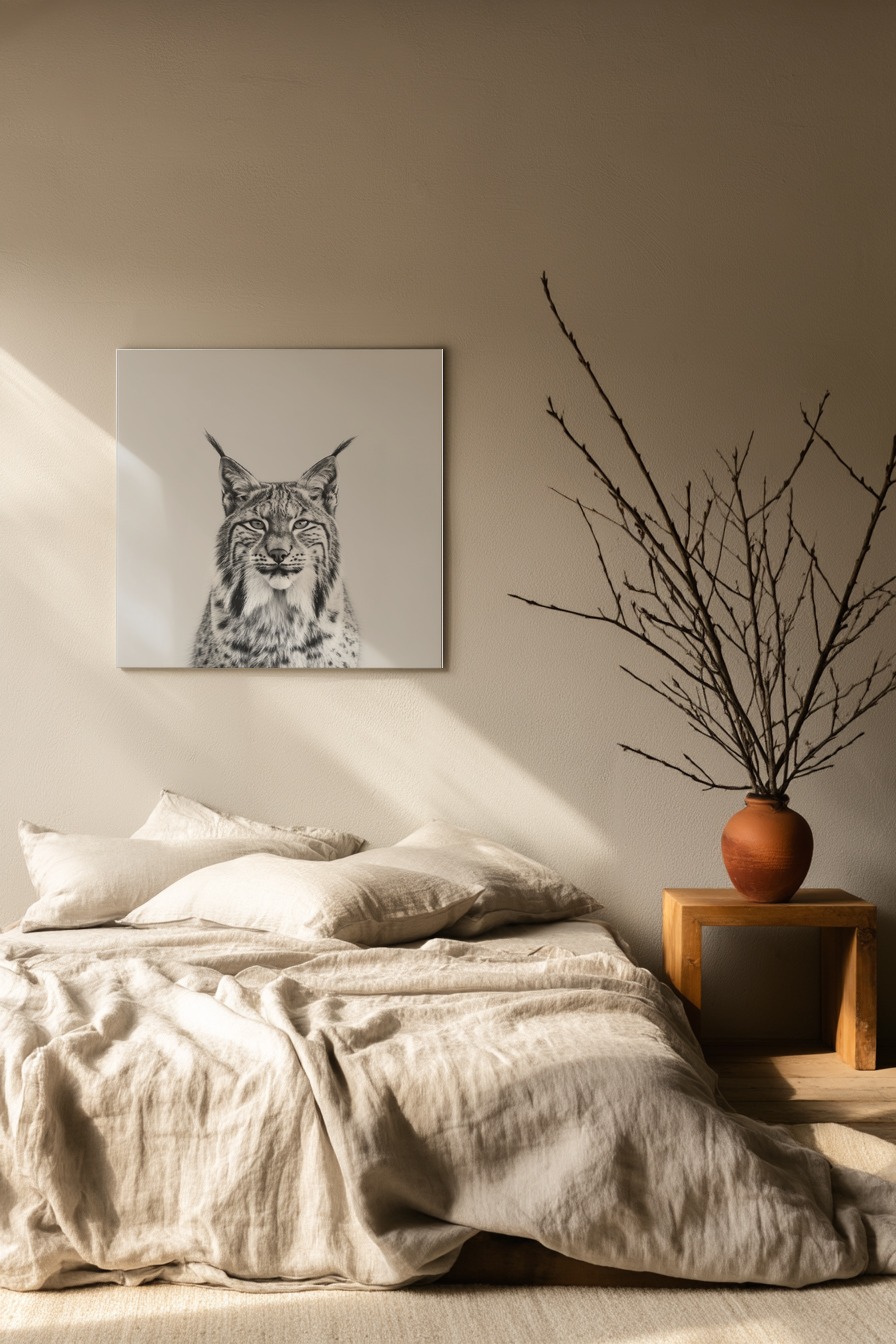 Frontalansicht eines Luchses. Detaillierte Fellzeichnung und Ohren mit schwarzen Pinselhaaren. Monochrome Darstellung.