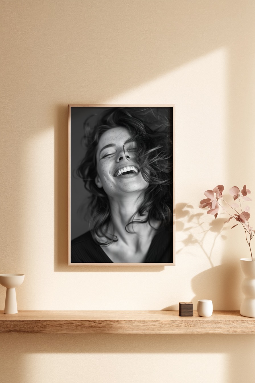 Das Lachen ist roh, echt und unverstellt, durch die Details im Haar wird die Lebendigkeit greifbar. Die Dynamik der Frisur bringt Bewegung in das klare Schwarz-Weiß-Porträt. Insgesamt wirkt das Motiv impulsiv und zeigt ungeschönte Freude.