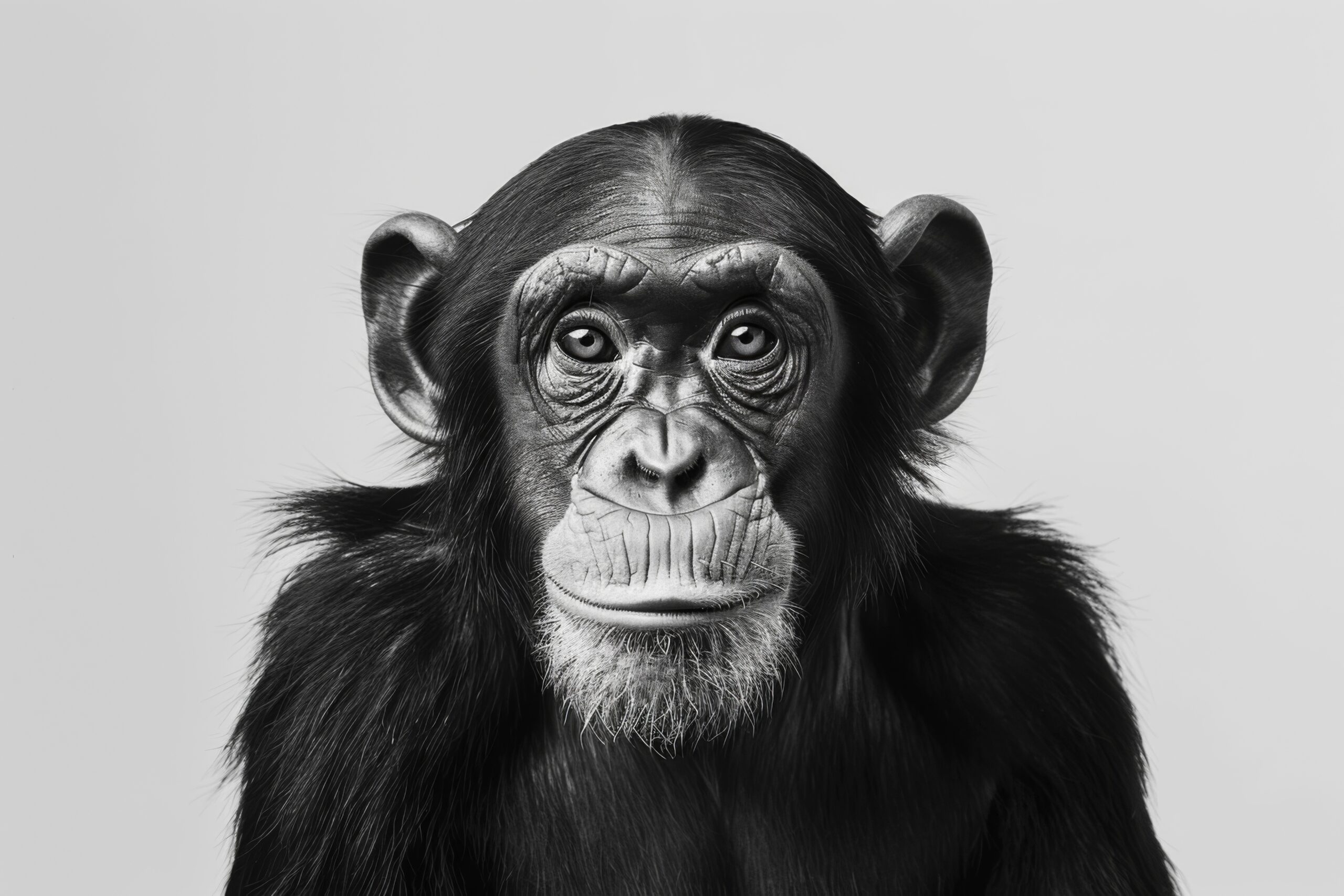 Das Gesicht des Schimpansen ist in klaren Details zu erkennen. Jedes Fellhaar und die feinen Linien der Haut treten deutlich hervor. Die Augen wirken lebendig und ziehen den Blick auf sich.