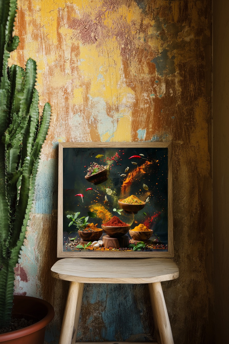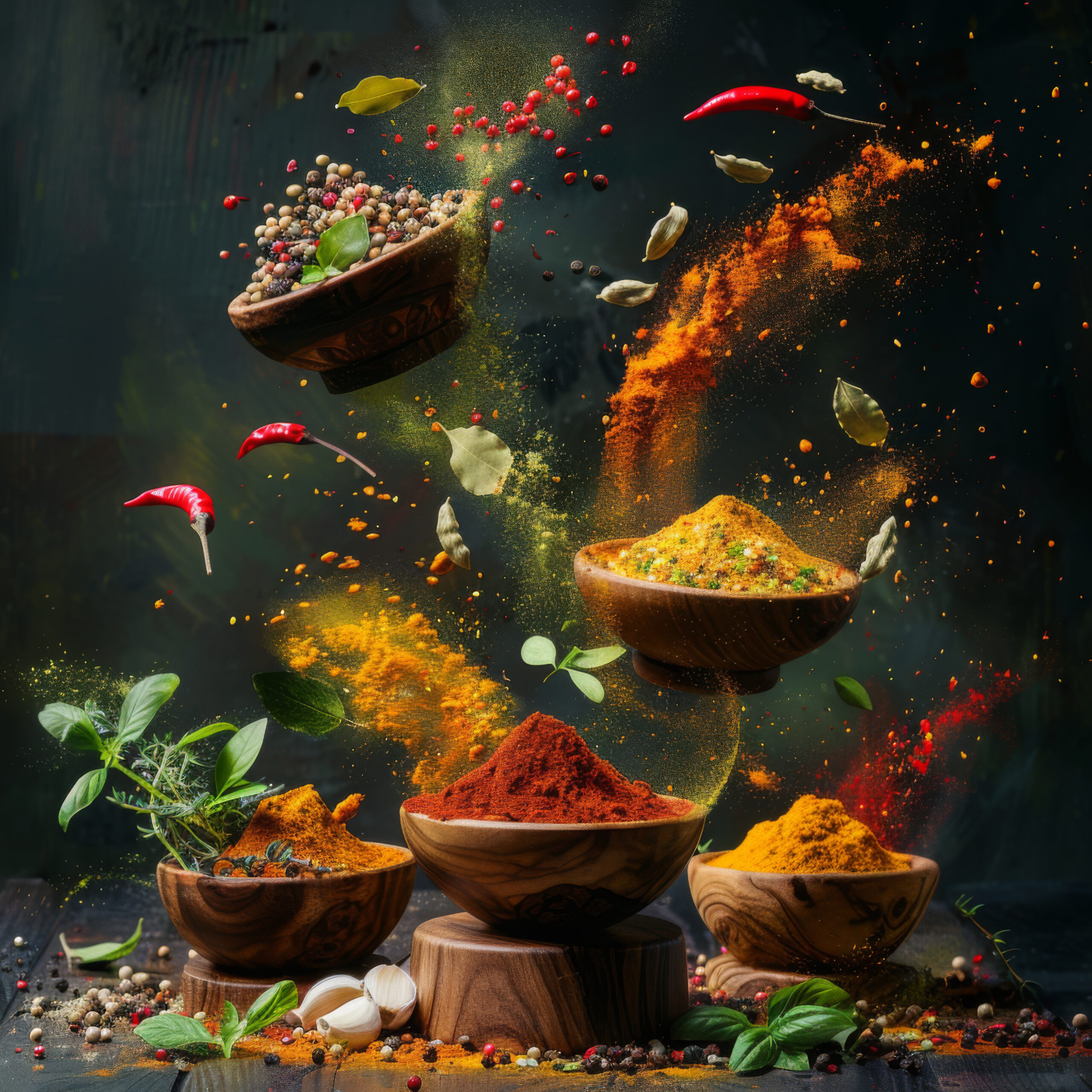Eine dynamische Explosion aus bunten Gewürzen und Kräutern füllt den Raum mit lebendiger Intensität und zieht den Blick tief ins Bild.