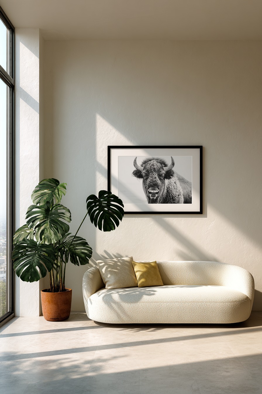 Dieses Bild zeigt eine detaillierte Nahaufnahme eines Bisons in schwarz-weiß. Die starke Präsenz und Textur des Fells sind deutlich sichtbar.