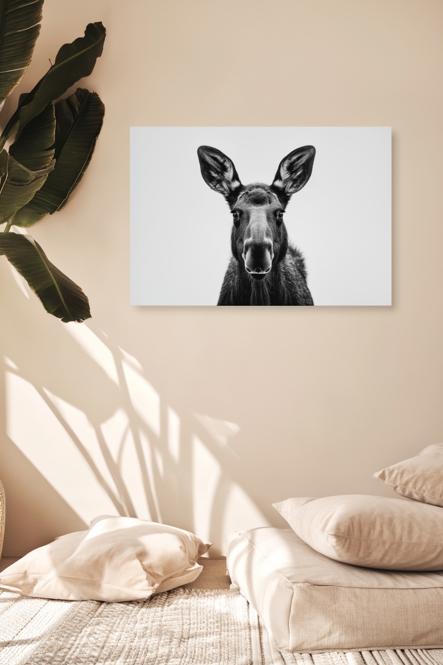 Große, markante Ohren mit feinem Fell. Schatten und Struktur in Schwarz-Weiß. Ein klarer, direkter Blick, der den Charakter einfängt.