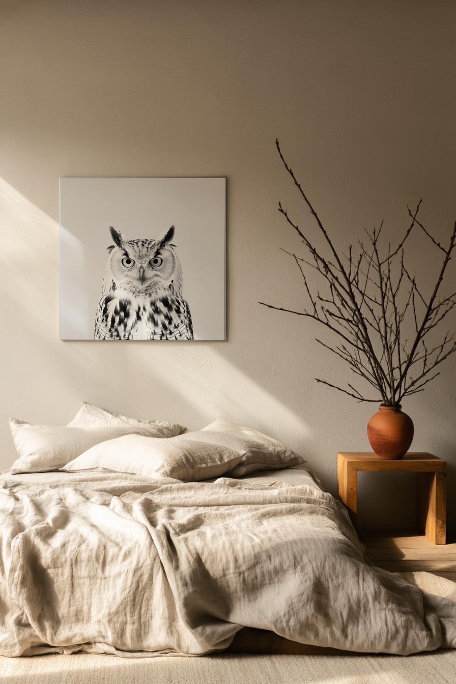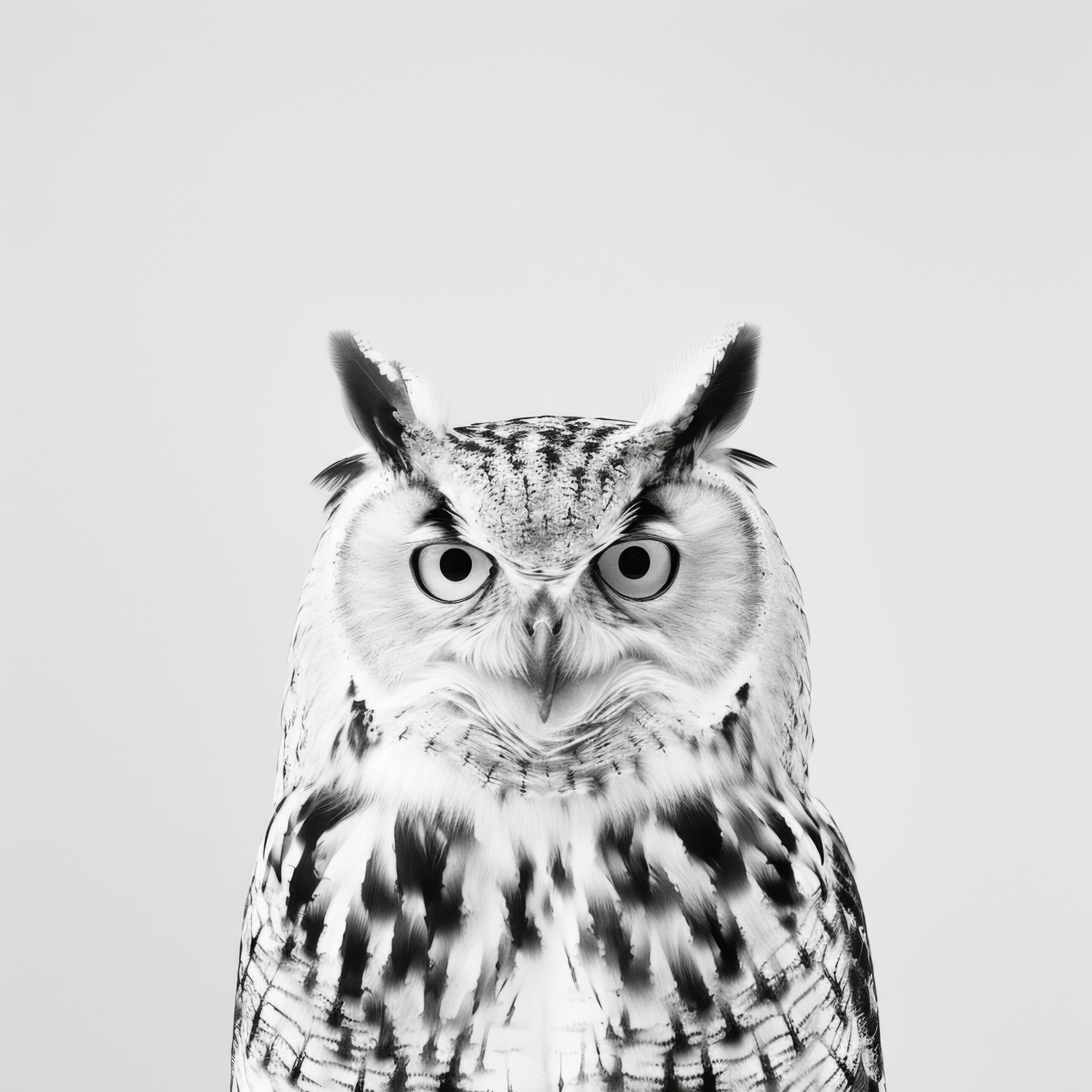 Die klare Darstellung der Federn und der intensiven Augen schafft eine faszinierende Präsenz. Kontraste zwischen hellen und dunklen Partien definieren die Struktur des Gefieders scharf. Die ruhige Komposition lenkt den Blick direkt auf das intensives Gesicht der Eule.