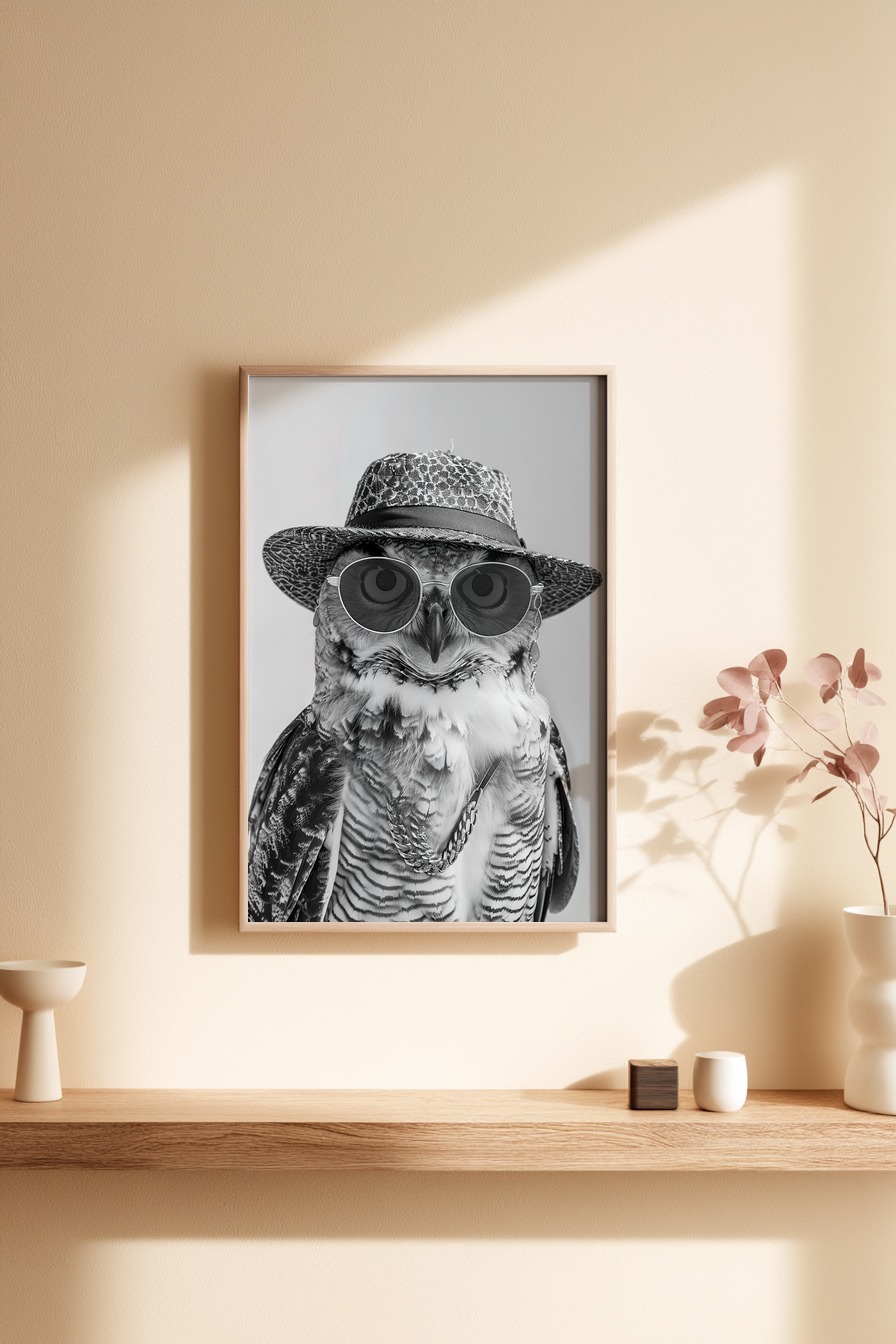 Fotografie Poster Eule mit Hut schwarz-weiß